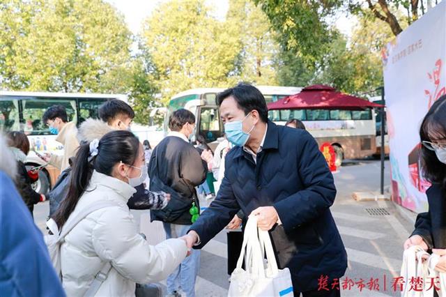 记者在现场看到,乘坐大巴的学生按照汉口站和武汉站分别间隔排队,从校领导手中领取暖心大礼包后依次登车。76名学生里,去往武汉站的有9人,去往汉口站的有67人。“乘坐学校的大巴,可以避免路上转乘多趟公共交通,很安全。”2019级经济学院学生张恒告诉记者,自己家住随州,以往回家,需要坐有轨电车,再换乘地铁,差不多要两个小时,转乘的时间比花在高铁上的时间都多。“得知学校开通回家大巴,我立马就报名了,还相约了几个同乡同学,大家互相照顾,安全回家!”张恒说。