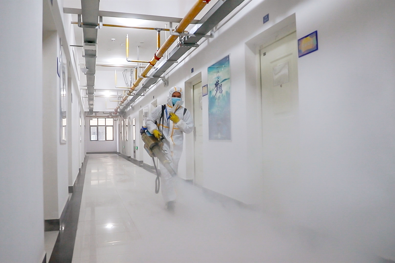 据了解,此次消杀工作共动用了4台脉冲烟雾机、6台背负式喷雾器及4台超低容喷雾机。脉冲烟雾机主要对垃圾站、走廊等大面积外围通道进行消杀,背负式喷雾器以及超低容喷雾机由于具有安全性高且无刺激的优点,负责室内区域的消杀工作。据校园管理中心主任丁琼胜介绍:“消杀工作将从早上8点持续到下午6点,覆盖校园全域,为学生放心返校营造良好环境。”