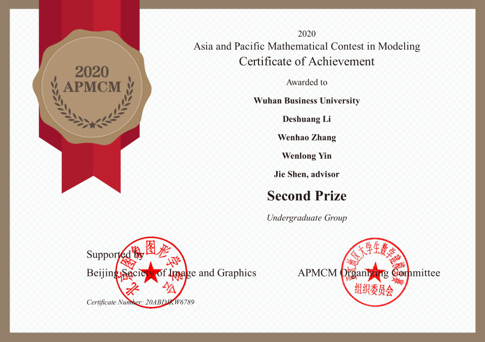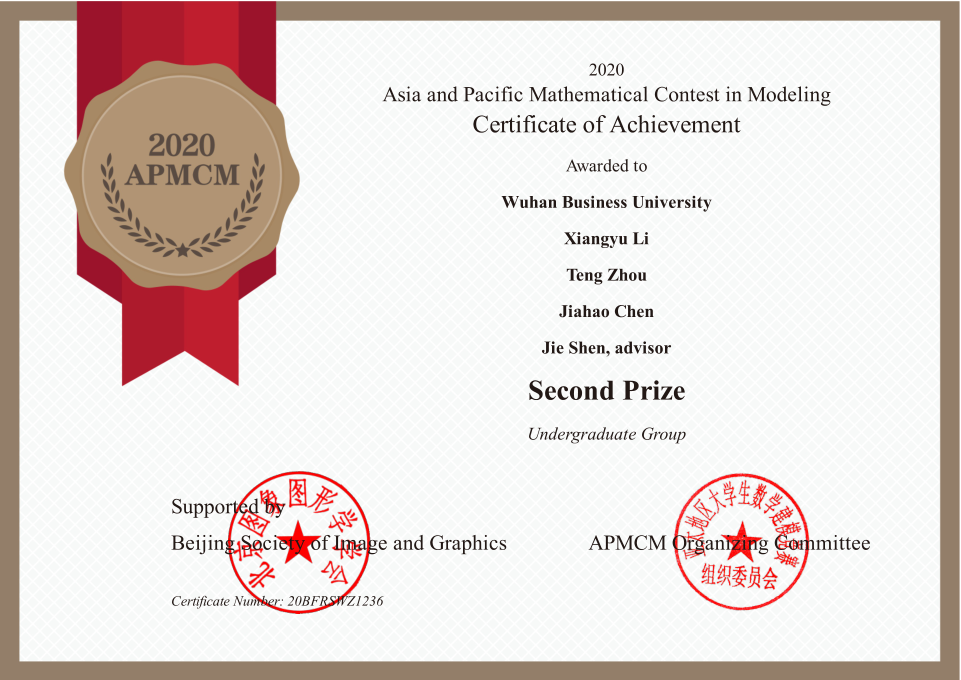 本网讯 近日,2020-2021亚太杯数学建模竞赛结果揭晓,信息工程学院两支学生团队分别获得亚太地区(APMCM)数学建模比赛二等奖。这是继2020年获得全国数学建模比赛湖北省赛区一等奖在获奖级别和获奖数量均创下该类型比赛历年最好纪录后,武汉商学院首次在参加亚太地区(APMCM)数学建模比赛取得的较好成绩。