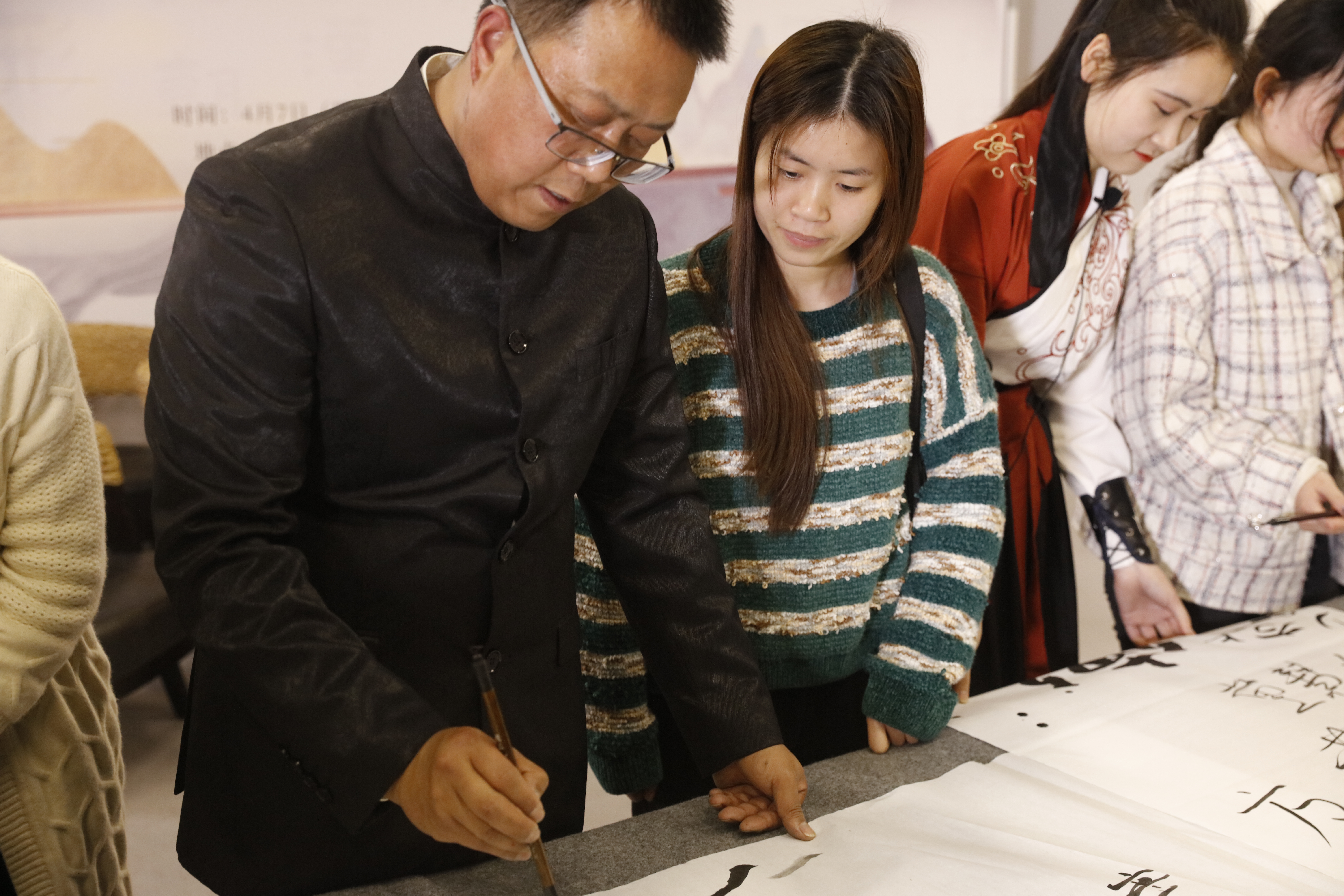 精心砚纸方寸小,酥手挥毫鸟飞天。中国书法和篆刻与其它艺术形式特别是中国画之间相互影响、相互渗透,紧密结合在一起,共同构成中国古代艺术的重要门类。活动现场,殷辉将宣纸均匀折叠平铺在桌面后倒上墨汁,一笔一划地将校训“商道惟诚,知行致远”八个隶书大字写在纸上,字字严谨,一丝不苟。殷辉还提笔“致远”两字送给同学“希望大家能像bwin必赢中国官网的校训一样,在未来路上越走越远,直到远方。”