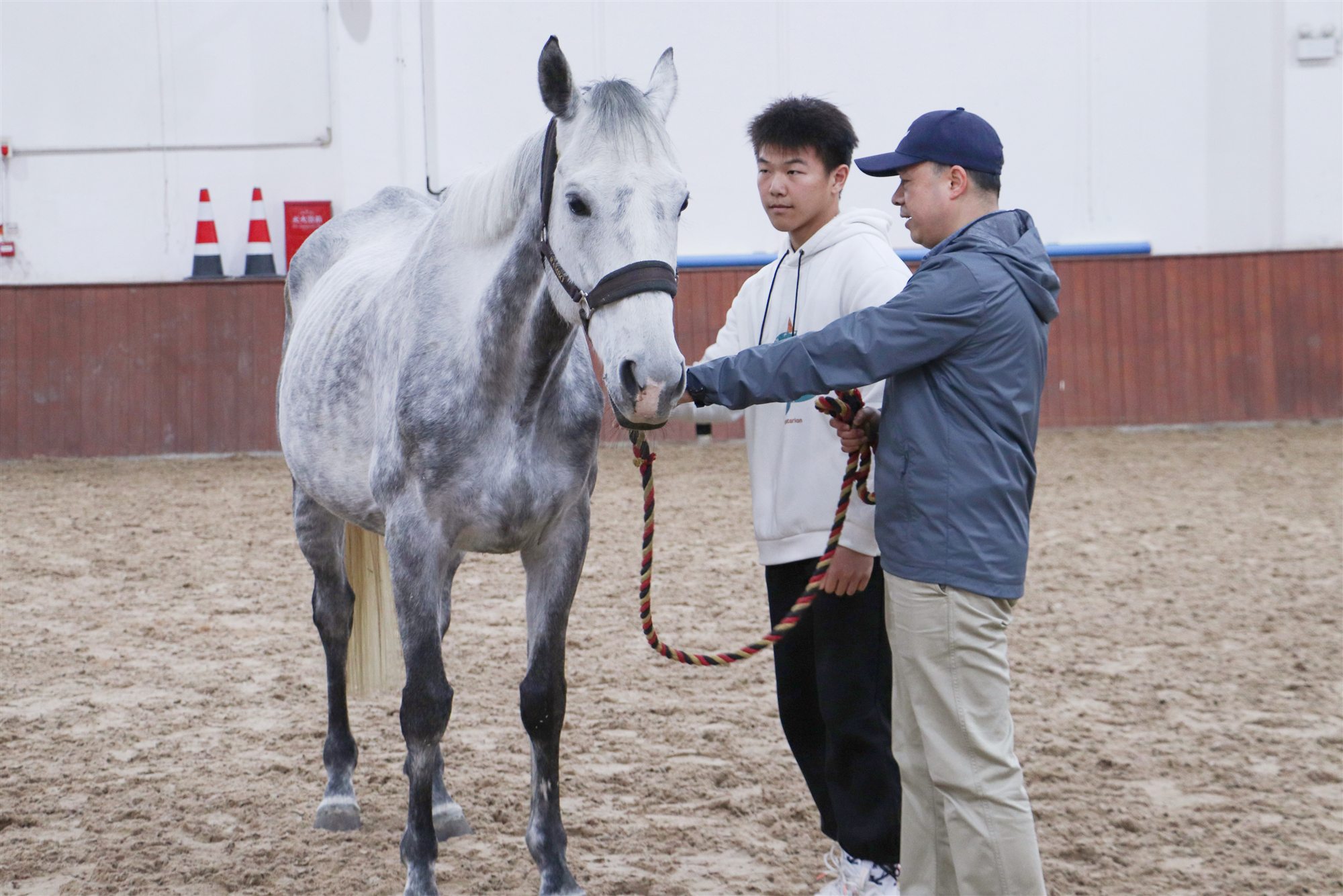 该课程的主要教材《赛马安全防范与救护》是由我校课程团队成员在总结马术行业从业人员经验和实践基础上,创新性打造出一套集马术安全教育知识、技能、社会责任为一体的国内马术安全标准体系,经过长期摸索后自行编辑出版的国内首部赛马安全防范与救护专业教材。教材分为“防范”和“救护”两个篇章。课程负责人王锋介绍道:“马术运动是唯一一项人与运动共同完成的体育项目,并且马儿胆子小、自我保护意识强,所以学生在与马进行接触的时候第一要务就是保证安全。”“防范”篇的第一章就是“马的习性”,学生需要了解马的生活习性、肢体语言等。同时,“防范”篇还包含“马匹操作过程中的安全注意事项”“骑乘过程中的安全注意事项”“马房防火的安全注意事项”等课程,既是为了给学生灌输更多安全意识,也是为了适应未来职业发展的需要。“救护”篇则更偏重于强调损伤后的急救和处理方法,让学生在遇到发生意外情况后具有急救处理的能力。“高水平马术俱乐部往往设置在郊区,医疗条件不便。此时我们的学生在学校学习到的知识就能派上用场,相对其他人来说更有优势。”王锋对此深感自豪。