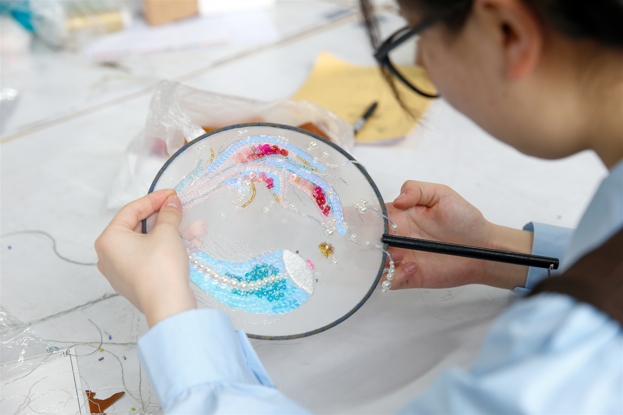 如今,艺术学院还将在课程中应用汉绣仿真虚拟实验软件,让学生在实践操作前进行作品“拟制作”,帮助学生更加大胆地进行创新创作,最大化地体现出学生的创意思维。不同的技艺、文化、风格进行融合,创造出更多不一样的可能。
