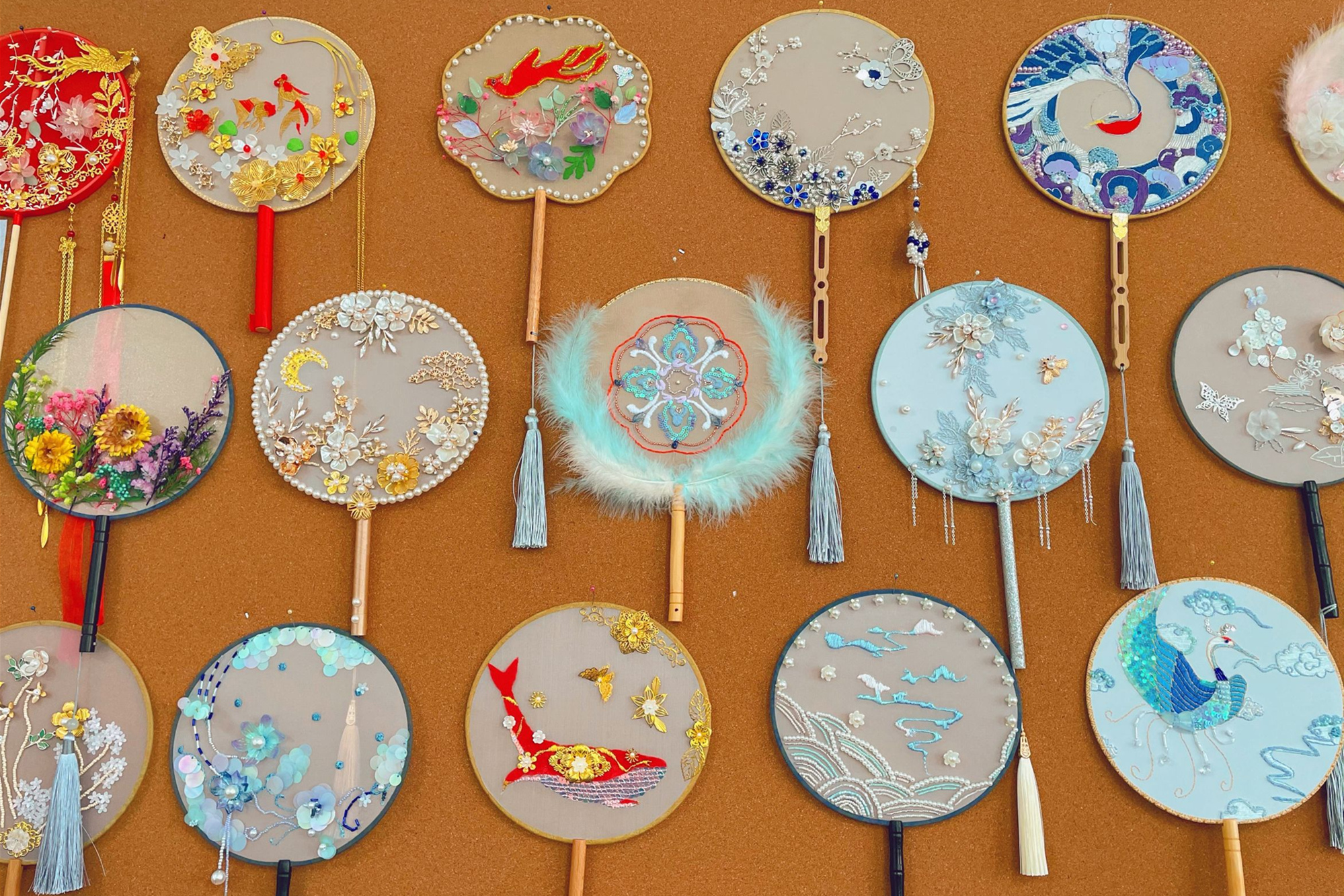 除了胸针,团扇饰品的设计与制作也是该课程的重点。“团扇的制定简单来说分为五个步骤,选定尺寸规格、制定纹样、设计风格种类、勾勒花纹以及刺绣。”课程负责人洪叶告诉记者,选定基本材料后,就需要进行纹样设计,一般选择中式花卉纹样进行设计与制作,再用专业水消笔在团扇上勾勒纹样,“最后再用针法对团扇的纹样进行刺绣,刺绣好了后我们的团扇也就制作完成了。”
