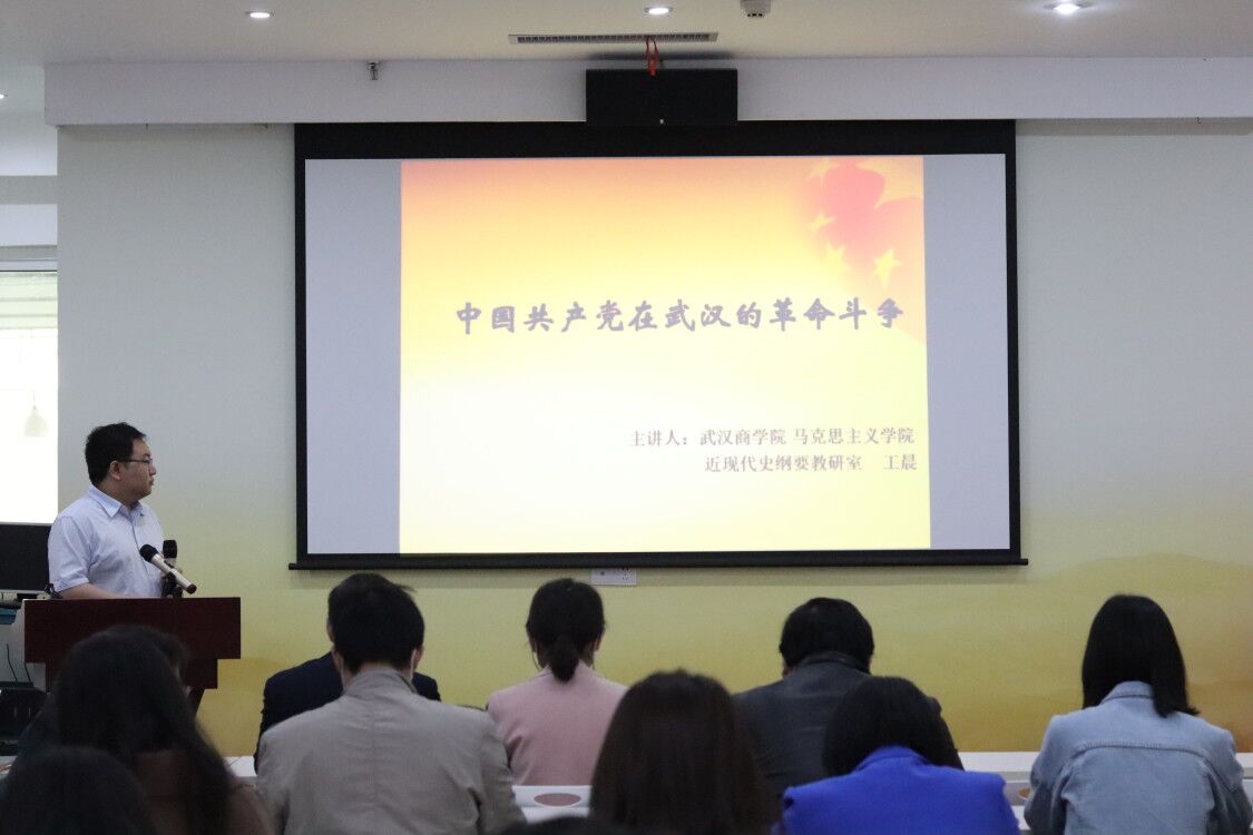 党课由马克思主义学院中国近现代史纲要教研室主任王晨主讲,他以《中国共产党在武汉的革命斗争》为题讲述了党中央及习近平总书记对历史学习的重视、武汉光荣的革命传统以及武汉共产主义运动史。特别讲到了武装起义与保路风潮、武昌首义、收回汉口英租界运动以及中共五大、八七会议等一系列重要历史事件,梳理了近代以来仁人志士和革命先辈在武汉的奋斗历程。一张张老照片、一个个鲜明的人物,让在座的党员们重温了那段艰难的革命岁月。党课结束时,王晨老师谈到:“我们现在的幸福生活是老一代无产阶级革命家艰苦奋斗而来的,要重视党史的研究、传承与宣讲,特别是面向青年学生的教育和宣讲。要从党的奋斗历史中汲取更多的精神力量,不忘初心,牢记使命。