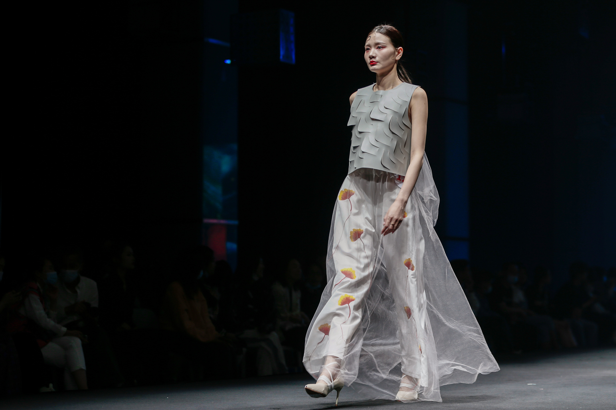 我校2013届优秀毕业生靳周来到现场,带来了自己的独立品牌“展菲儿”,向大家展示了新生代时尚的风帆。2021届优秀毕业生作品“囍”“焦灼的灵魂”“镀金时代”“白色富士山”等展现了作者对传统与现代艺术的理解与感悟。作者结合不同的艺术元素,用其独特表达方式,传达不同的情感。“庭”的古色古香,“囚”的挣扎与束缚,“觅·鹿”的灵性,“大繁至简”的初心,各种思想与服饰融为一体,体现了设计者独一无二的审美,传递出对未来无尽的憧憬,及对服装服饰行业的拳拳真心。来自2017级服装与服饰设计王洋的作品《沙漠星空》在众多优秀作品中杀出重围,荣获一等奖。“在设计时,我运用编织的手法体现沙漠的纹路,用刺绣的方法将银白色星空装点到衣服上,激励人们无论处于什么样的艰难境况,都能像在一望无际的沙漠夜晚里抬头看到星空,充满希望。”王洋说。