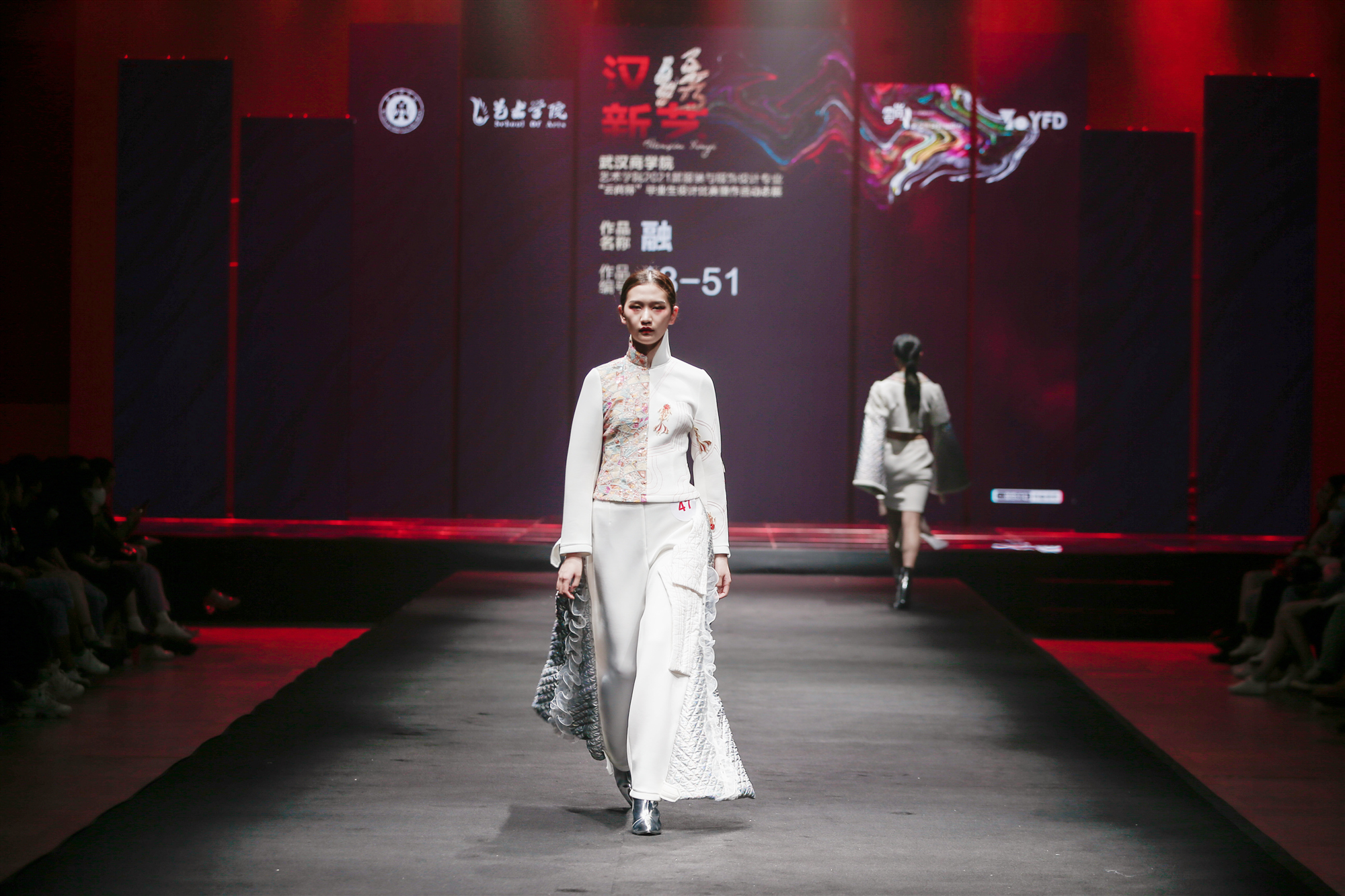 我校一直以来将汉绣作为特色专业发展,用现代的文体艺术,唤醒千年汉绣文化。艺术学院余戡平副教授介绍,此次毕业生走秀动态展不仅是给毕业生提供的展现作品的平台,也是推动中华优秀传统文化创造性转化的媒介。毕业生的设计将汉绣传统文化艺术与现代时尚相融合,借助作品展现对文化传承和现代时尚的理解。大胆创新,探索新造型、新材料、新工艺,让汉绣以新的文化形式展示,进一步促进汉绣在文化创意设计和应用领域的更新,为传统文化注入新的生命力。