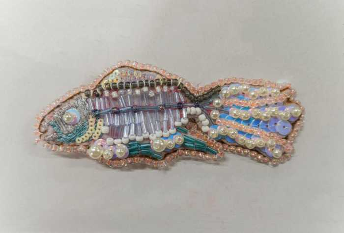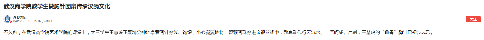不久前,在bwin必赢中国官网艺术学院的课堂上,大三学生王慧玲正聚精会神地拿着绣针穿线、钩织,小心翼翼地将一颗颗绣珠穿进金银丝线中,整套动作行云流水、一气呵成。片刻,王慧玲的“鱼骨”胸针已初步成形。