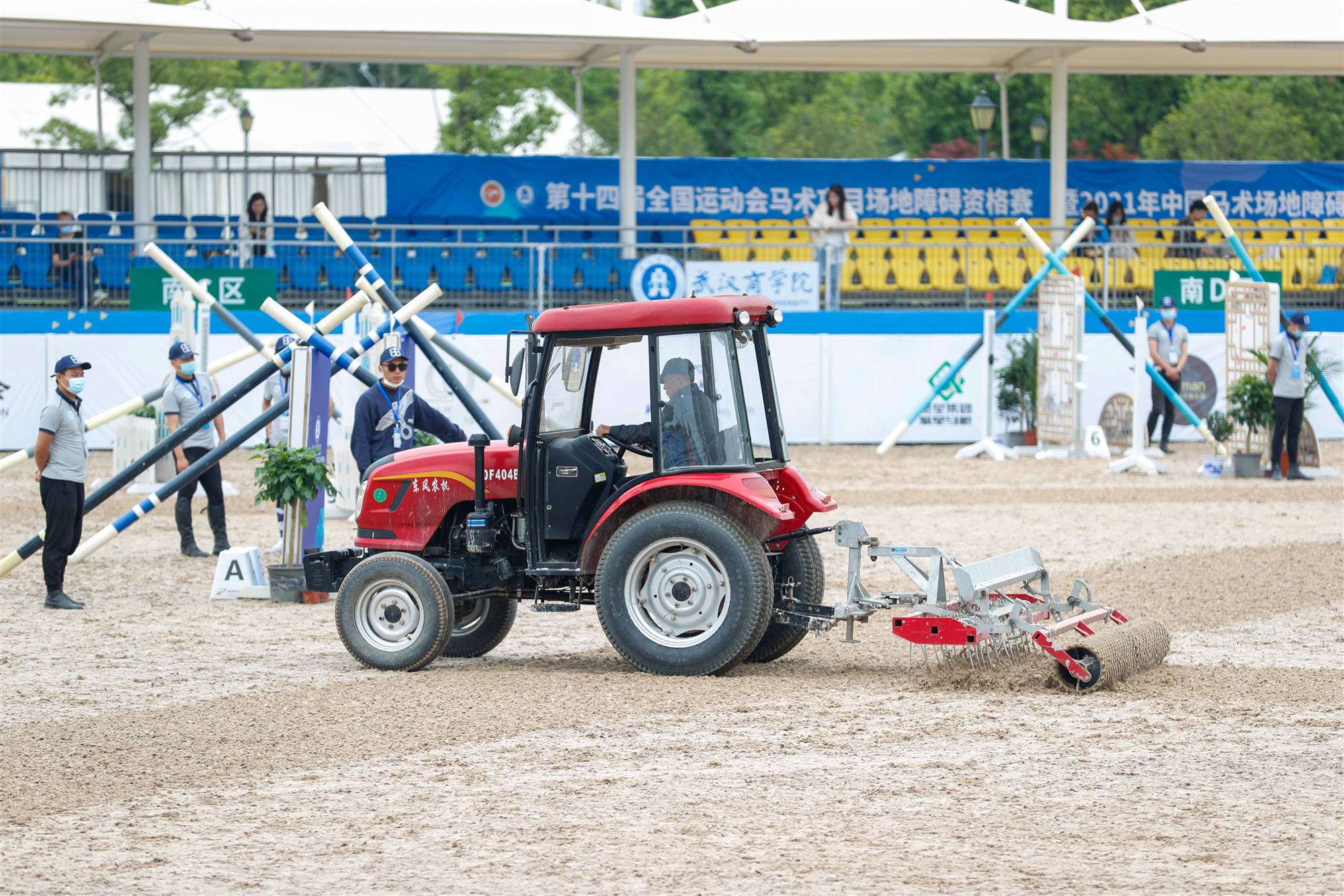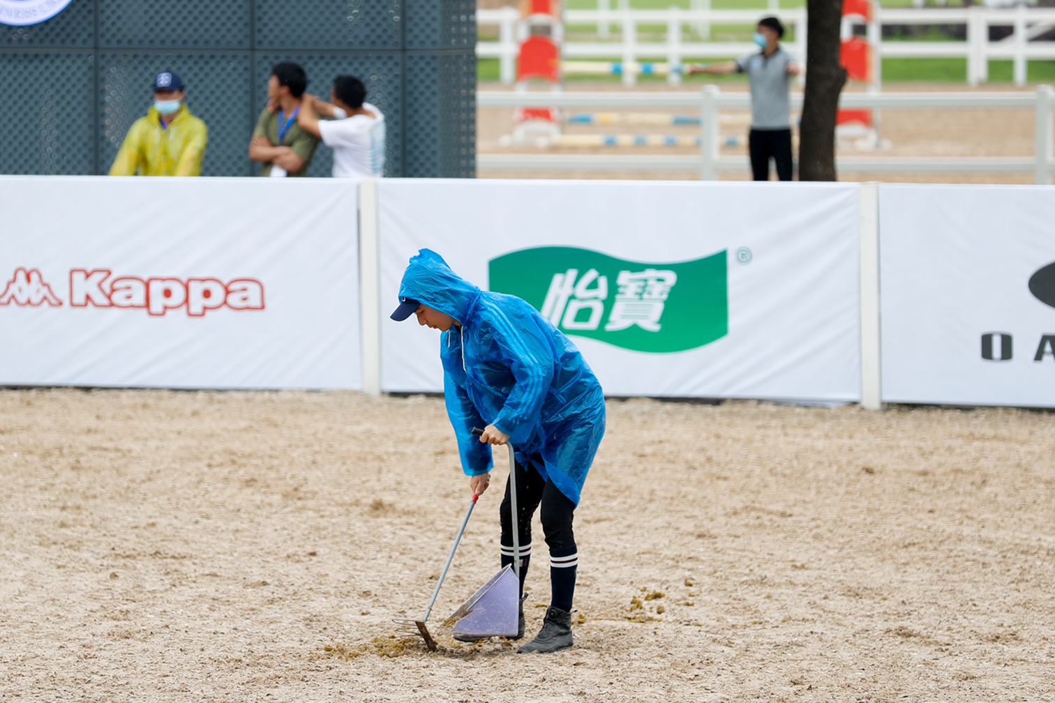 比赛开始前,我校体育学院·国际马术学院精心选拔104名志愿者,分别服务在马房、赛场、指挥中心等12个贯穿赛事始终的要处。“路线设计组共有19人,负责辅助路线专家对赛场进行调整,将撞落的障碍杆摆回原位,及时清理赛场马粪,维护赛场正常秩序。”我校2019级社会体育专业冯国玮介绍到。在为期三天的比赛中,冯国玮和其他志愿者始终候在赛场一角,时刻关注着赛场的情况。每当有赛马撞落障碍杆,便第一时间将其归位,保障赛事继续进行。“这两天下雨,湿滑的场地给整理工作又添加了难度。鲜艳的颜色和随风飘动的衣摆都会吸引马儿的注意力,为了防止因我们的失误对人马组合的安全造成威胁,我们不能打伞、也尽量不用雨衣,要在最短的时间里复原障碍。”冯国玮说。