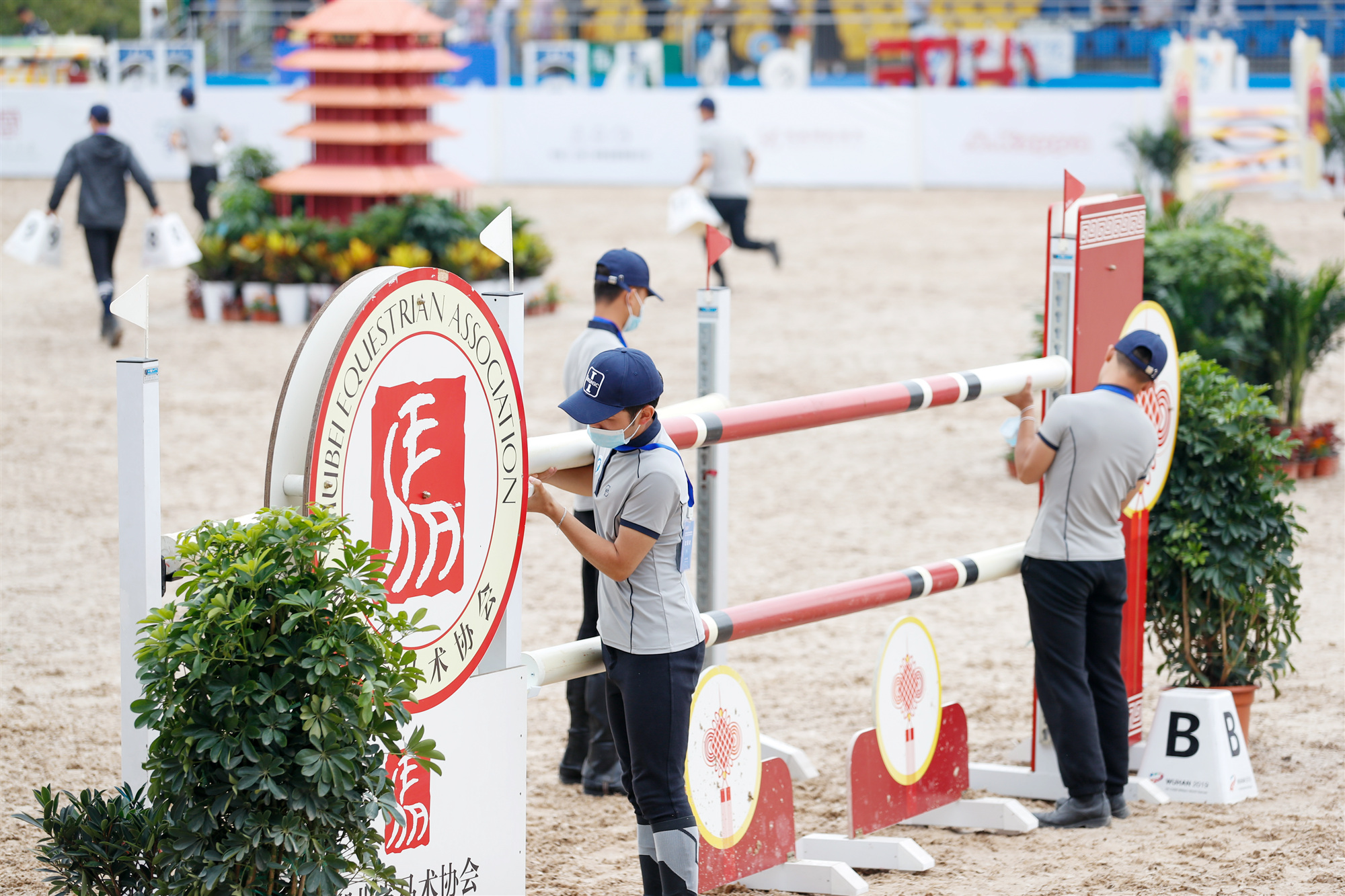 我校驭马体育公园是第七届世界军人运动会马术及现代五项赛事的马术比赛场馆、湖北省第一个国际标准马术基地,集马术竞技、观赛体验、媒体转播、马厩服务于一体,具备承办国际高水平马术比赛的经验和实力。马术纤维砂场地是湖北省内规格最高的纤维砂场地。按设计质量要求,从荷兰进口织物与纤维,结合武汉的气温、气候等条件,按比例混合专业石英砂后进行铺设。铺设完成后,赛马踏上去,马蹄入砂深度必须确保在10毫米至40毫米之间。除此以外,我校还设有专业的马医院和马匹违禁药物检测中心,全力保障参赛马匹的健康安全,确保马术赛事顺利开展。