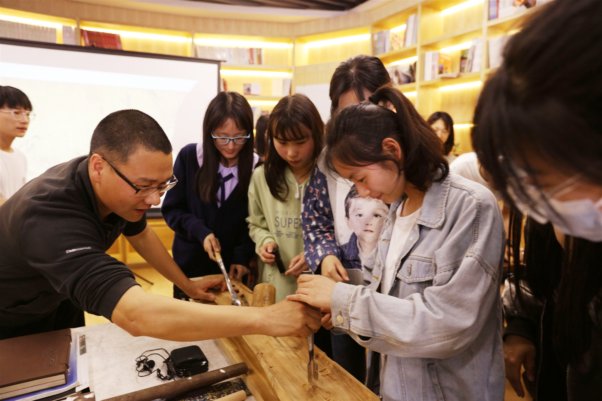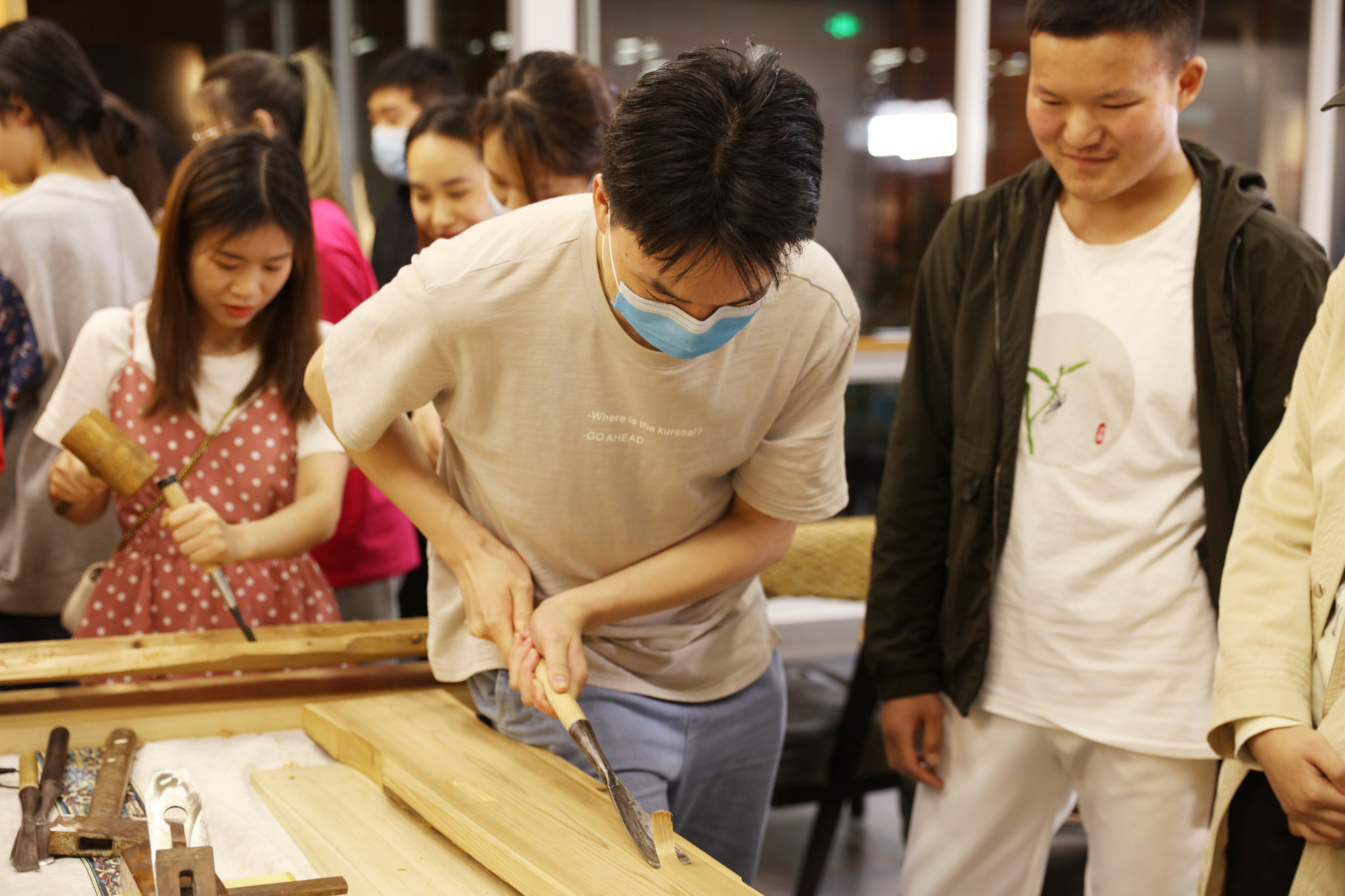 为了使同学们近距离接触古琴,李涛邀请所有同学靠近展示台,在与古琴零距离中向同学们传达别样感受。李涛拿出专业的刨子、圆铲、斧头等工具,手把手的教授同学斫琴。在李涛的专业指导下,同学们对于工具的使用愈发熟练,每个人都能在光滑的木头表面刮出漂亮的刨花。2019级旅游管理学院陈金娜已经是第四次参加国学小课了,“之前从来没有这么近距离接触古琴,今天能有机会在现场感受和触碰它,在琴身上真真切切感受到了它蕴含的魅力。”在陈金娜的印象里,每堂国学小课都让她仿佛在历史中“穿梭”,记忆深刻。