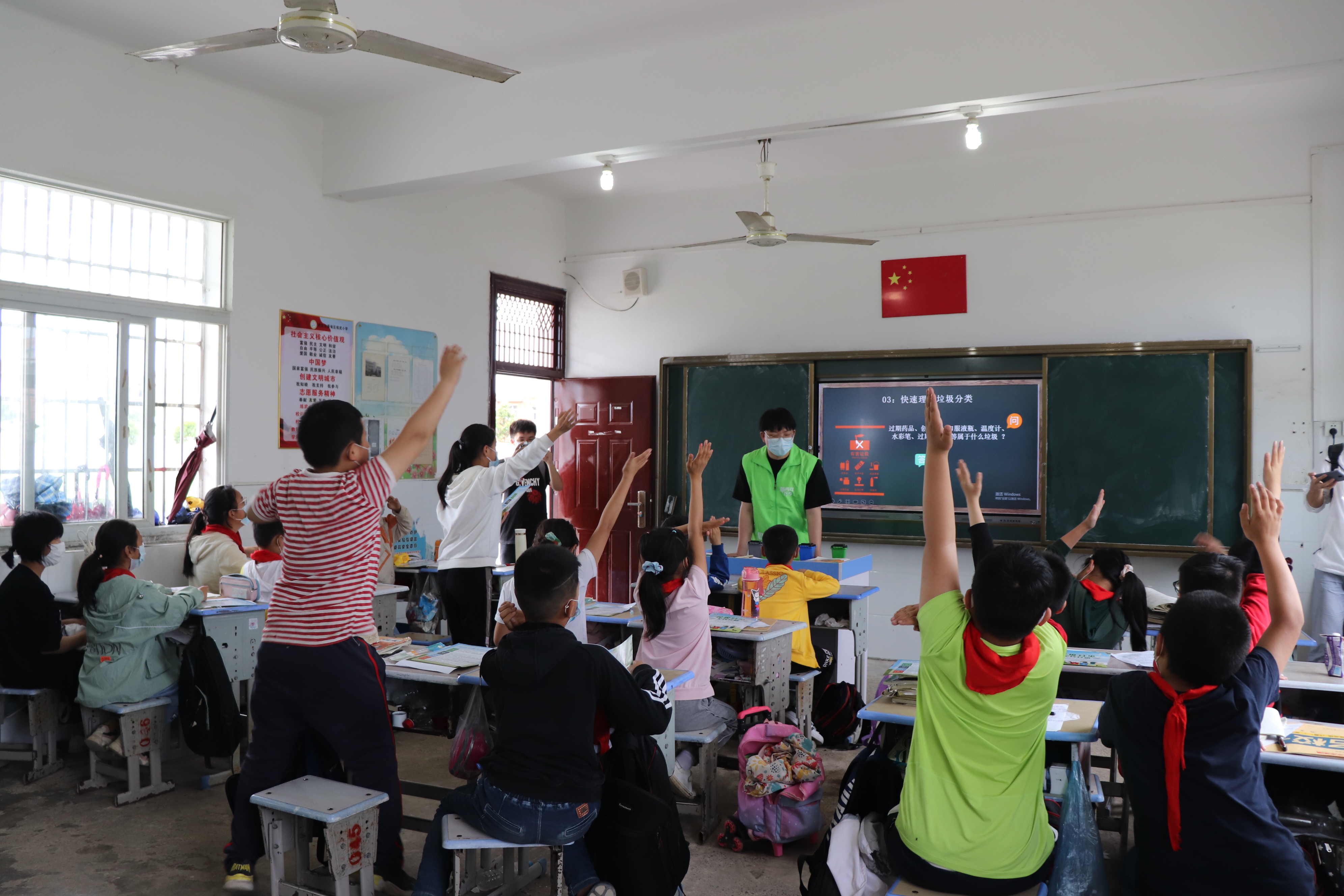 到达练武小学简单与校方对接后,在不影响学生学习的前提下,大家积极开展垃圾分类宣传活动。大家按照活动安排分成两队,分别进入四年级、五年级教室给小学生播放垃圾分类宣传片、分发“垃圾分类—全民活动”宣传单,观看ppt了解垃圾分类基本知识,在问答中加深认识。五年级的胡宇泽同学说道“自己以前对于垃圾处理有些随意,这次学习后懂得了垃圾分类,还有四种颜色的垃圾箱啦,以后会做好分类的”。随后,大家和小同学们一起分组进行垃圾分类卡片的游戏活动,在游戏互动中模拟垃圾分类,在笑容欢语中学习知识,大学生携手小学生共同与环保节约相伴相行,创造美好环境与生活。