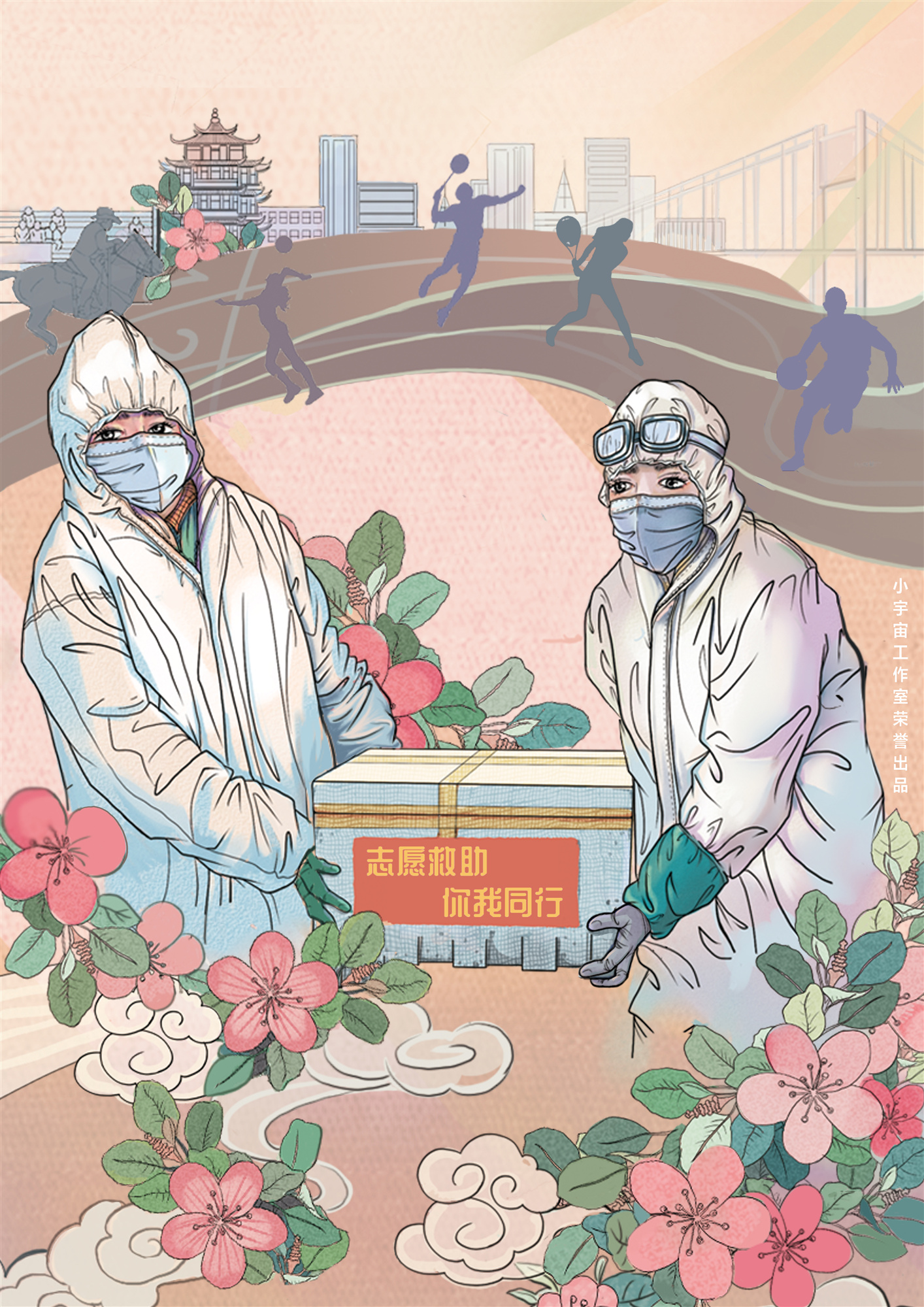 “平凡有大爱,甘做螺丝钉”、“国家有需要,党员冲一线”、“抗疫第一线,上阵父子兵”……12幅插画里,下沉社区志愿者们为居民值守门岗、分发物资、消杀环境、登记信息的真实场景被一一再现,辅之祥云和鲜花的点缀,一股满满的治愈感呼之欲出。4月27日,周宇创作的系列插画“期待春天”正式结稿。在一个月时间里,她和艺术学院李欣怡、刘帅兰、曾婷3名学生一起搜集资料图片,结合防疫工作创作了这12幅作品,向武汉的保卫者致敬。“当时武汉疫情形势逐渐好转,所以我想利用自己的专业所学,向社会贡献一点自己的力量,也想向大家及时传递出武汉被‘治愈’的喜悦。”周宇回忆起当时的创作情景,依然为疫情中大家的默默付出、无私奉献感动。同时,包含医护人员、解放军、环卫工人等抗击疫情9个形象的龙马精灵也是周宇当时向 “逆行者”创作的作品之一。