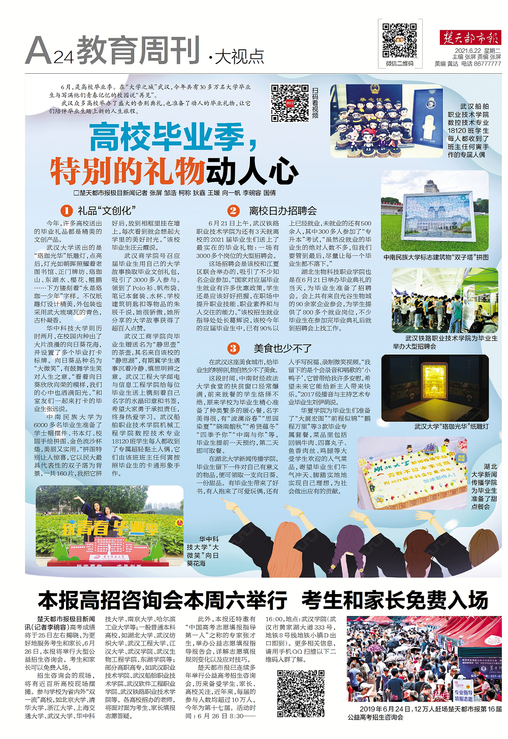 6月22日,楚天都市报24版教育周刊《高校毕业季,特别的礼物动人心》专版中,报道bwin必赢中国官网毕业季用故事换取文创礼物,获取学生一致好评。