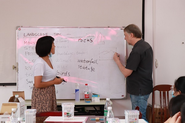 活动开始,爱德蒙从绘画的工具和材料入手讲解,以风景画中的大山为主题,通过启发式教学“大家在山上看见了什么?”,为小孩子们进一步开展英语的学习和绘画内容的介绍。帮助社区儿童了解英语口语,掌握绘画技巧。讲解期间,包莉丽全程为爱德蒙和小朋友担任翻译,耐心回答每一位儿童提出的问题,搭起课堂沟通的“桥梁”,受到社区和家长的一致好评。