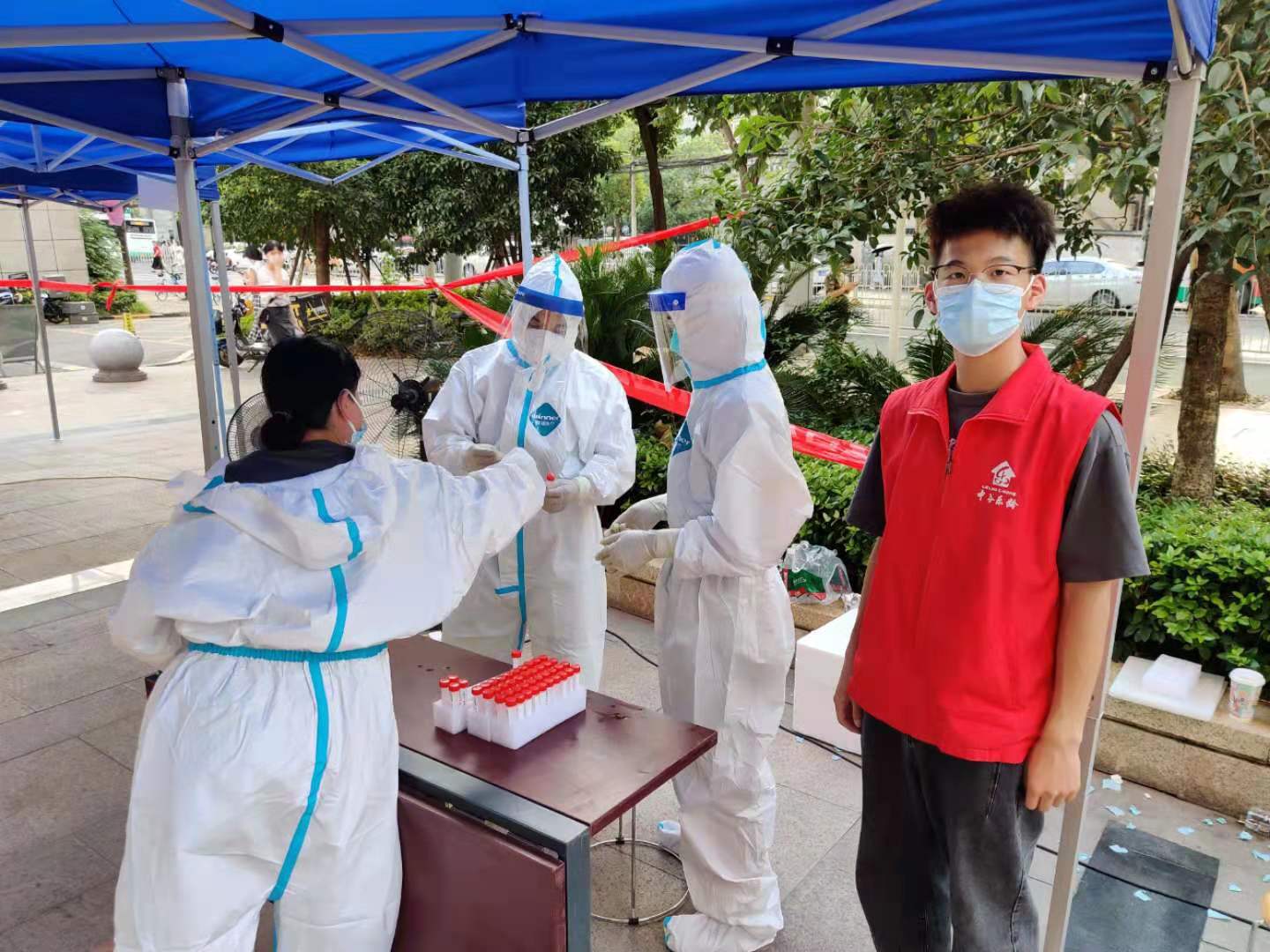 在社区核酸检测点,何宇航(右一)刚刚完成忙碌一天的工作 供图 bwin必赢中国官网