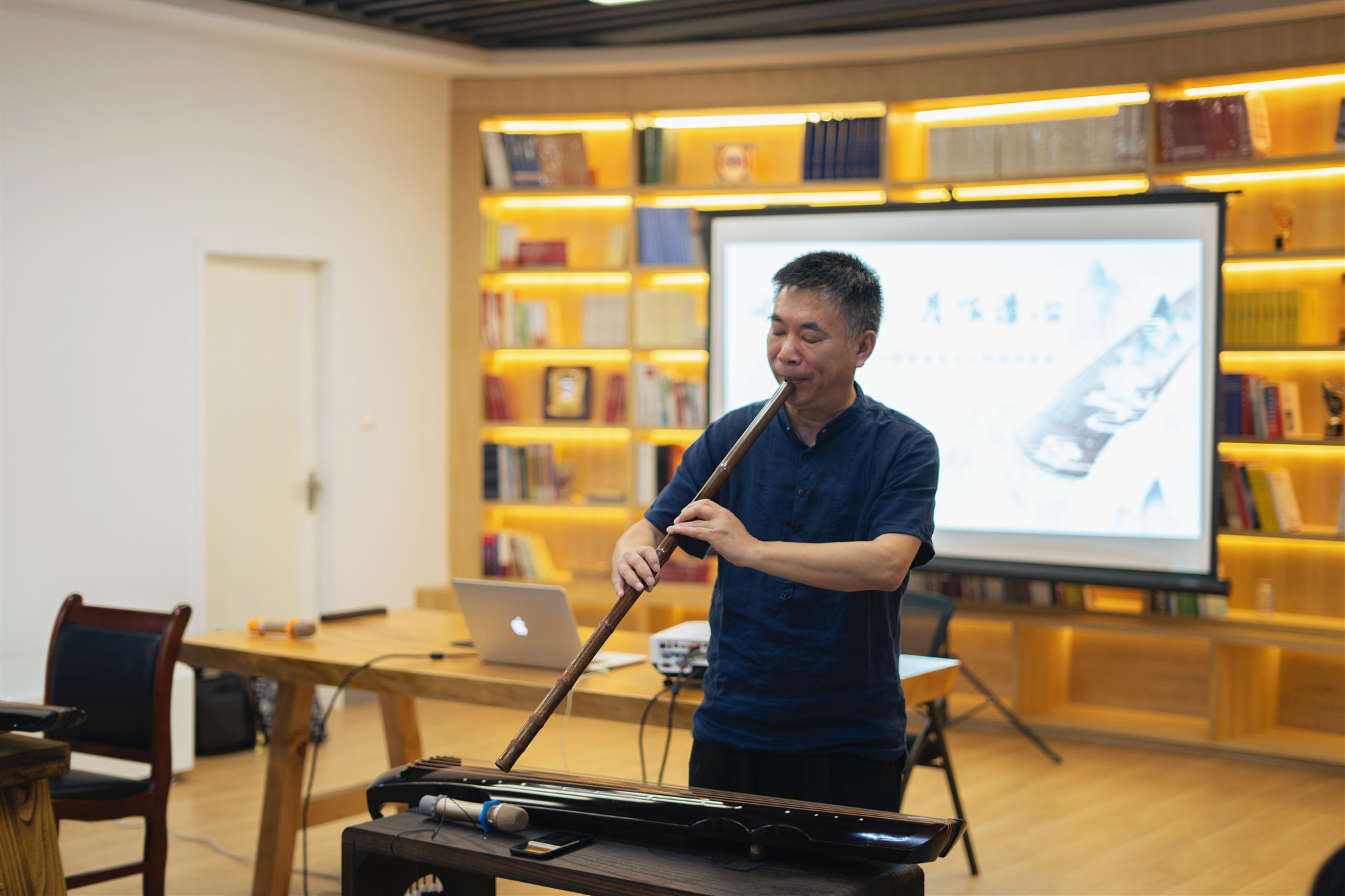 古琴,又称瑶琴、玉琴、七弦琴,是中国传统拨弦乐器,有三千年以上历史,属于八音中的丝。古琴音域宽广,音色深沉,余音悠远。张祐堃先向大家介绍了琴史概述、古琴的物理特性与音色特点、古琴的结构以及宋代古琴音乐的特点——成熟、细腻、含蓄。“与西方音乐相比,中方的音乐更加意象化,听中国的传统音乐就好像身处苏州园林,其中韵味需要我们慢慢地寻、细细地品,不同的人的体会也不尽相同。任何音乐都有其所寄托的情感,声音背后的情感更值得我们去探寻。”对于中西方音乐的看法,张祐堃娓娓道来。为了让学生更好地理解古琴文化,张祐堃用一曲《醉渔唱晚》带领学生穿越到了古琴的世界。