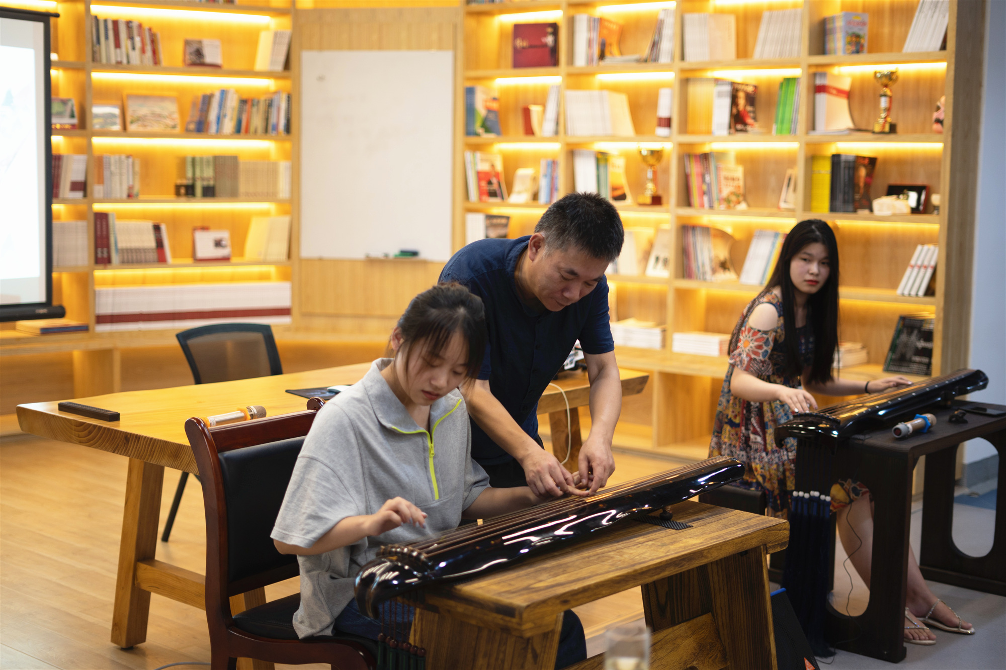同时,张祐堃邀请了两位学生上台弹奏《沧海一声笑》。在张祐堃的教导下,两位同学很快便弹奏的有模有样。2020级工商管理学院郭美伊告诉记者:“这是我第一次接触古琴,我的手抚上琴弦的那一刻感觉特别的奇妙,突然就理解了古人为什么这么爱弹琴。这堂国学小课激发了我对传统音乐的兴趣,我想将这份兴趣一直延续下去。”临近中秋,张祐堃和周飞、林一蓓两位老师又为学生们演奏了一曲《良宵引》。良宵、良宵,我醉欲眠君且去,明朝有意抱琴来,古琴的特色在现场演奏中得到了充分的诠释。悠韵的琴音与舒缓的箫声构建起了一幅和谐的画卷。
