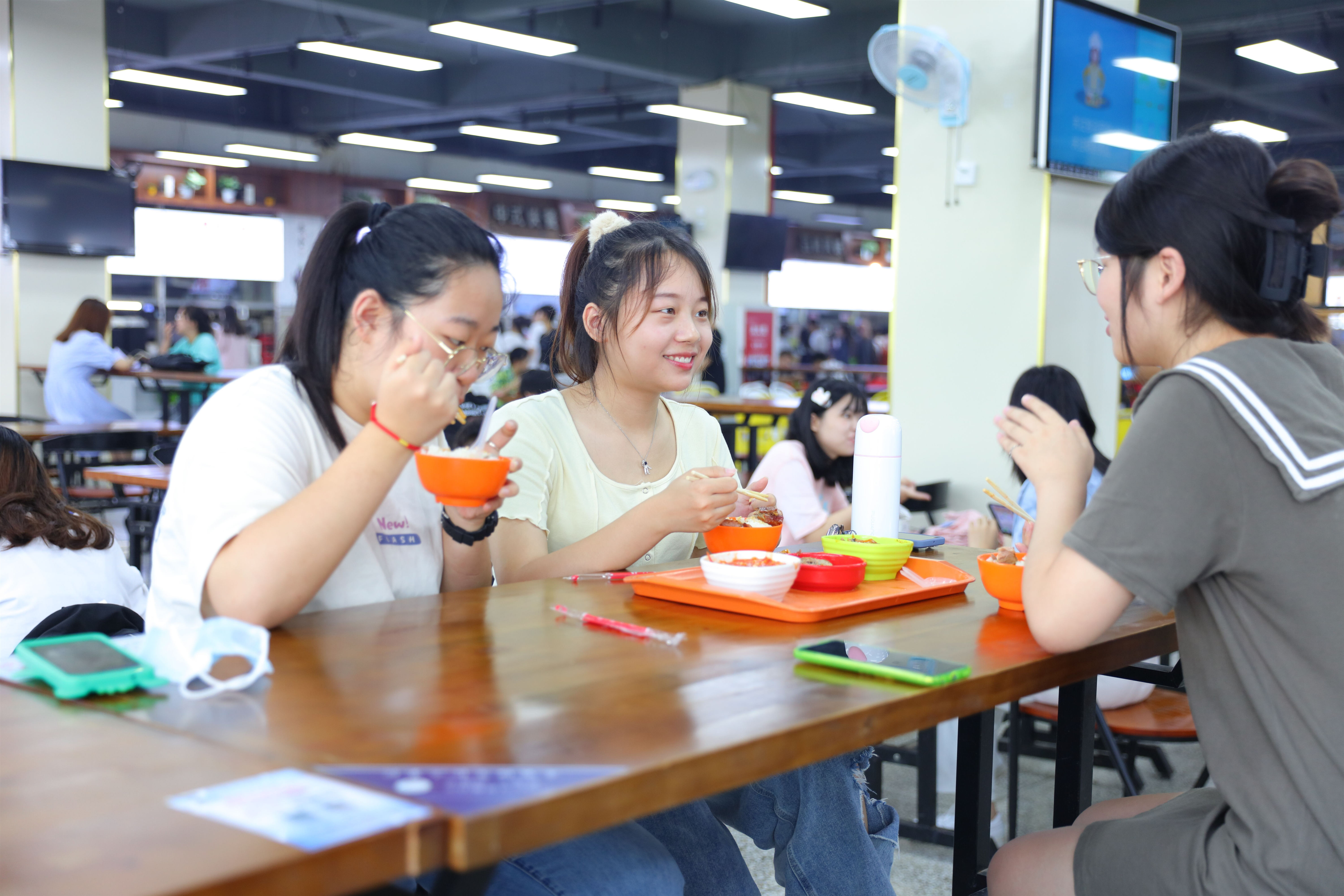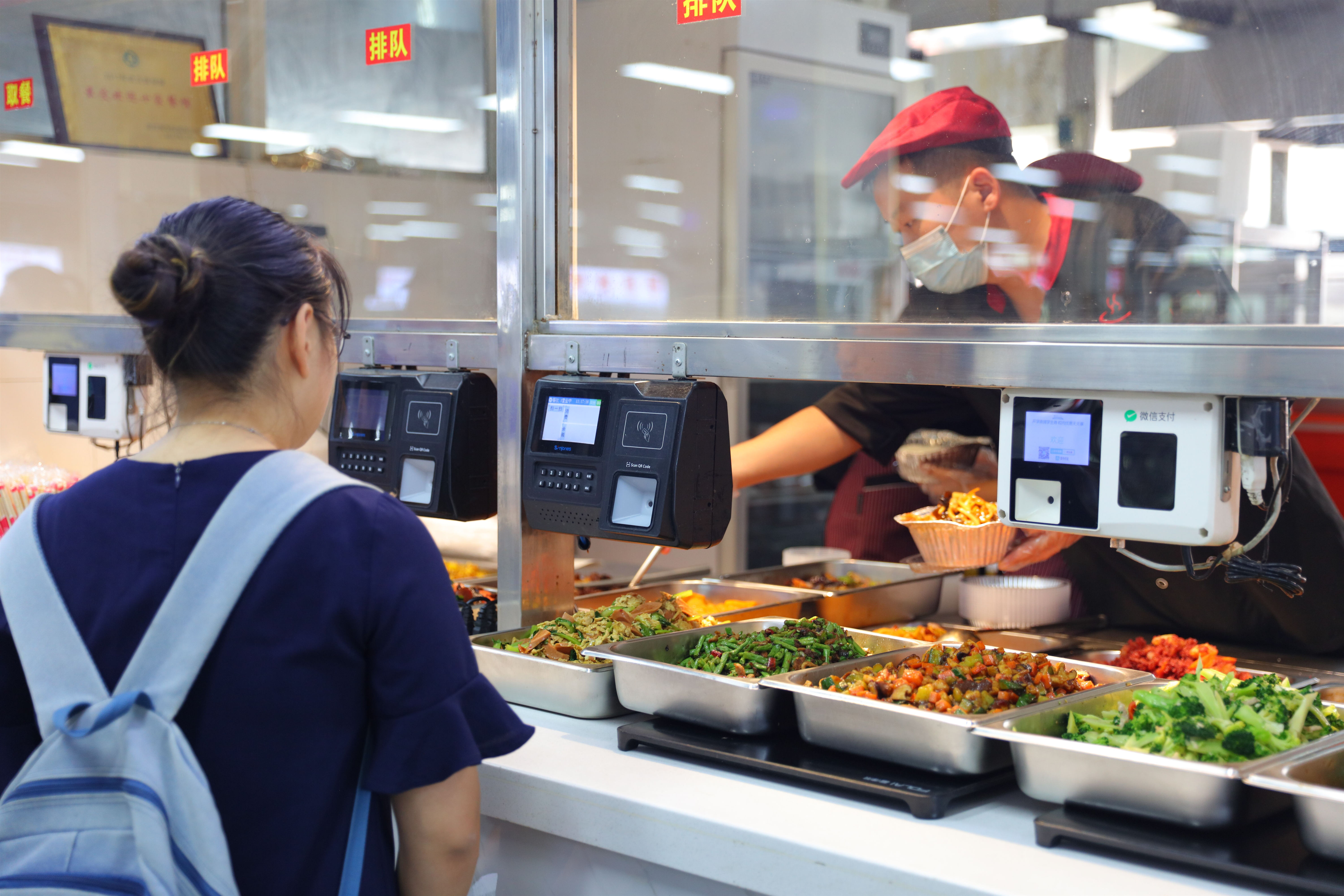 北区会成美食餐饮全新亮相。崭新的桌椅、全新的灯牌显示屏、新的卡布灯箱让整个餐厅焕然一新。大厅吊顶、LED灯光铺设,为师生营造了温暖舒适、整洁有序的就餐环境。据餐厅负责人彭凯介绍,餐厅一楼、二楼所有墙体以PVC防火材质包墙,防火防虫的同时提升了餐厅整体整洁度;餐厅后厨安装了48个高清摄像头,实现食品制作实时监控,保障师生“舌尖上的安全”。大厅摆放的绿植让学生在课余时间缓解视觉疲劳、《毛泽东》等红色书籍让学生利用碎片化时间阅读,同时餐厅新推出“焖锅饭”、“蛋包饭”等菜品备受学生好评,引入的智能防疫宣传机器人节约了人力成本,新颖的方式更易让师生接受。