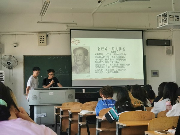 在毛泽东诗词鉴赏会上,《七律·长征》、《采桑子·重阳》、《沁园春·长沙》等多篇诗词被同学们讲解分享,融合新形式下的思政课程引发了大家的强烈讨论和学习热情。万里长江横渡,极目楚天舒,毛泽东主席笔下的《水调歌头·游泳》是全班同学们最感兴趣的一篇作品。学生讲解员徐紫阳从毛泽东主席十八渡长江的经历出发,结合实景游泳图片和视频资料真实的向大家再现伟人风采,引起同学们的一致惊叹。