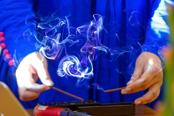 为了让同学们进一步了解篆香以篆香的使用,至淳拿出香具请同学们亲手实践“打香篆”。大家仔细摆放好工具,理香灰、抹平香灰、清香篆、填香粉、起篆、清理,起香所需的六项工作在同学们全神贯注下有条不紊的进行,大家认真使用手中的工具,生怕在某个环节上出错,以破坏了香的品质。随着时间推进,同学们在文雅而清净的非遗楚香中细细品味。“有趣,挺需要耐心的,而且在平常的课堂上很难学到这种有趣的国学知识。闻到自己亲手打造的香的味道会让人有一种甜甜的安详和幸福感”2019级旅游管理学院谢冰看着她亲手制出的香开心地说。其他在场的同学们也认真端详着自己的作品,点好篆香后,纷纷与自己的作品合影。随着一个个篆香的燃起,教室里炊烟袅袅,沁人心脾。