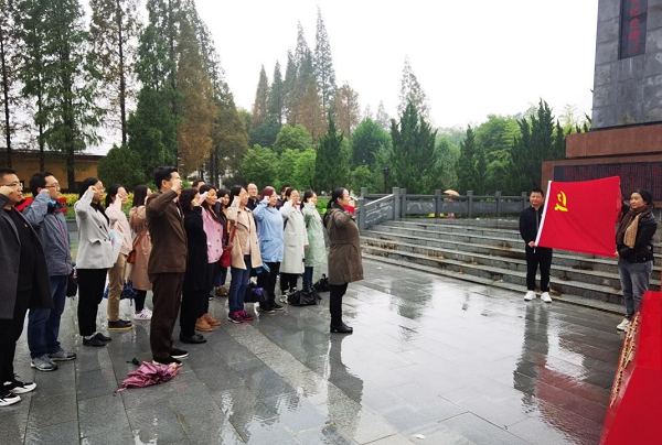 参观了根据地旧址之后,全体教师冒着寒风秋雨,来到瞿家湾革命英雄纪念碑前祭奠先烈,展开鲜红的党旗,齐声重温入党誓词,通过庄严的宣誓为此次党建活动画上了圆满的句号。