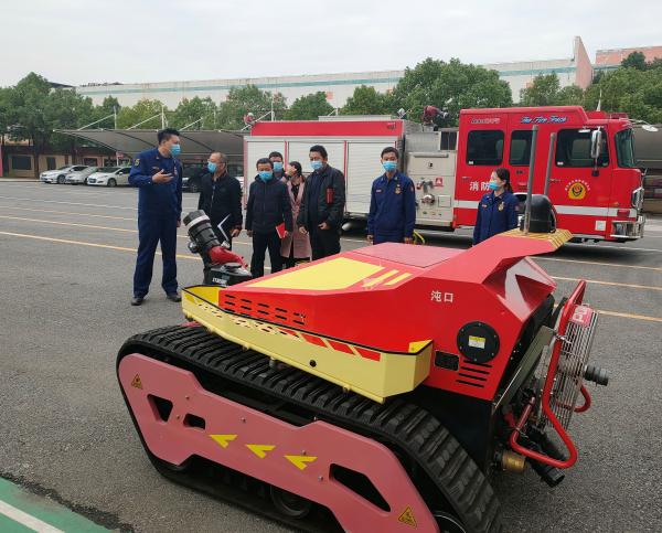 开发区消防救援大队政治教导员向我们介绍了他们的最新装备:消防坦克。消防坦克在高温或者是有毒的环境下,它可以代替消防员“身先士卒”,在最危险的时候,它可以去侦查火情并且灭火。操控人员在1千米以外可以实时操控它,拖水带过去进行灭火。同时它还装了热成像和摄像头,最大限度发现周围的状况。整体机器是防爆处理的,它的外部能忍受1000摄氏度的温度,履带是橡胶的,最高耐温可以达到800摄氏度,可以接近火点有效灭火。