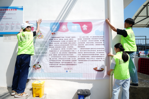 本网讯 走进武汉市蔡甸区侏儒山马赛村的时候,一群穿着绿马甲戴着白帽子的大学生在村内的空白墙面上张贴着已经制作好的膳食营养宣传海报.他们是来自我校食品科技学院的新青年下乡团队成员。成员们正在给身后的当地居民发放宣传册,开展膳食营养小课堂,为他们普及有关膳食营养的知识,鼓励居民们养成健康科学的饮食习惯。