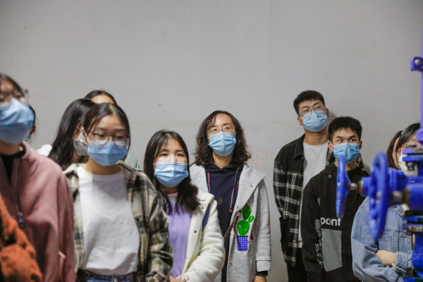 地下室内各种管道纵横交错,吸引同学们来到了消防水泵房、地下室通风机房,与前面不同,在这里邱庆龄让同学们当老师,通过他们的回答来进行补充与纠正。同学们都对银色的“大管道”充满疑惑,邱庆龄笑着介绍:“这个是通风管道,看着银色的部分是因为材料通常采用镀锌钢板,这个管道还配备控制阀门,地下室通风设备的设置有助于火灾中的排烟和空气循环。”