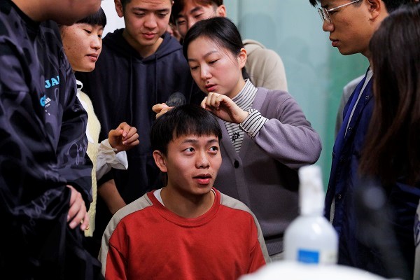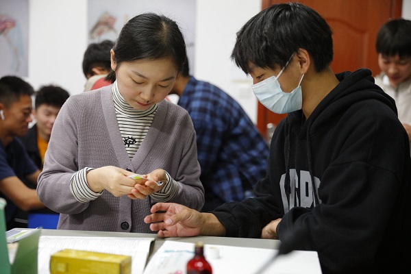李怡运用直透刺法、斜透刺法、平刺透穴法的原理分别用一寸、三寸、一至一点五寸的针灸针为体验者扎手臂、腿部以及头部百会穴的穴位。同学们纷纷围上前观看,尤其对头部腧穴刺法感到好奇。“头部血管丰富、毛囊众多,要掌握好针刺角度、方向和深度。”李怡捻转着针灸针,将其上下移动。学生胡彩虹对针灸课很感兴趣,她表示每周一节的针灸课能让自己学到很多知识,针灸具有疏通经络调和阴阳的作用,自己原先略有些酸痛的小腿经过老师的针灸疗法后改善了许多。