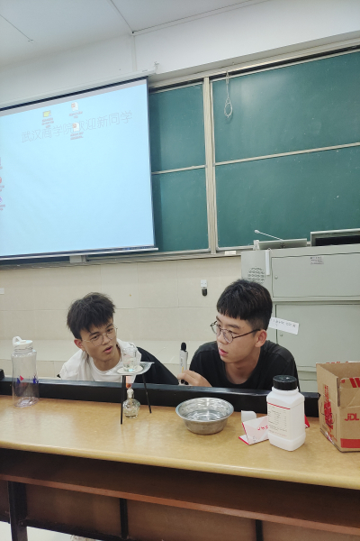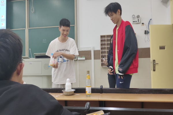 “化学小课堂”不拘泥于形式,学生们可以录制好实验视频到课上播放,也可以选择结合自己的PPT来讲解化学原理,其中最有趣的则是课堂上的现场实验。学生们带来的科普和实验都与生活息息相关。有同学对鸡蛋煮久之后蛋黄变成黄绿色这个生活现象进行科普:蛋白质受热变性过程中会产生硫化氢气体,当硫化氢气体遇到蛋黄中的铁元素时就会形成硫化亚铁包裹在蛋黄外面;有的学生为大家做“绝密情报”的实验:由于柠檬汁中含有赛璐酚的成分,把它写在纸上,用火一烤,就能呈现出黄色的字;还有可乐与牛奶混合后产生的碳酸钙沉淀,用小苏打、食用油、白醋和色素就能制作的简易熔岩灯……只存在于书本上的知识通过有趣的试验生动的出现在大家眼前,而《基础化学》也成了学生们每周最期待的课程。“很多实验以前只是听说过,没有机会和条件自己动手去做,在肖老师的课堂上除了能亲自做实验,还可以学到很多生活相关的知识,原来自己身边处处都是化学。”学生唐玥开心的分享到。