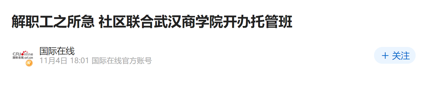 国际在线湖北消息:“有了社区的托管班,孩子有了好去处,我心里踏实了,工作也更积极了。”11月3日晚,武汉经开区全力北辖区企业职工熊清涛下班后,不慌不忙地前往全力北职工社区的职工子女托管班接孩子,曾经对“孩子放学早,无人照看”的担忧不复存在。托管班给熊清涛的生活带来的便利,这也只是社区近两万名企业职工的缩影.
