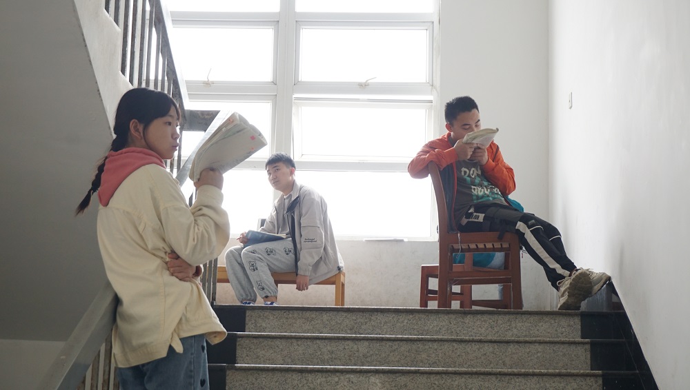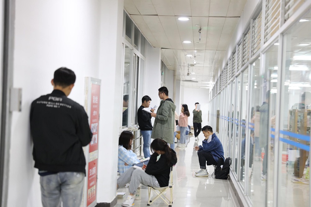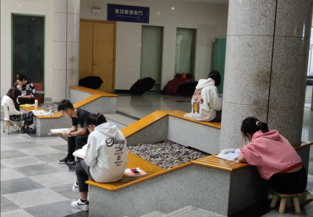 11月5日,中南民族大学图书馆一楼走廊,考研学生们正在背书。刘芝妞 摄