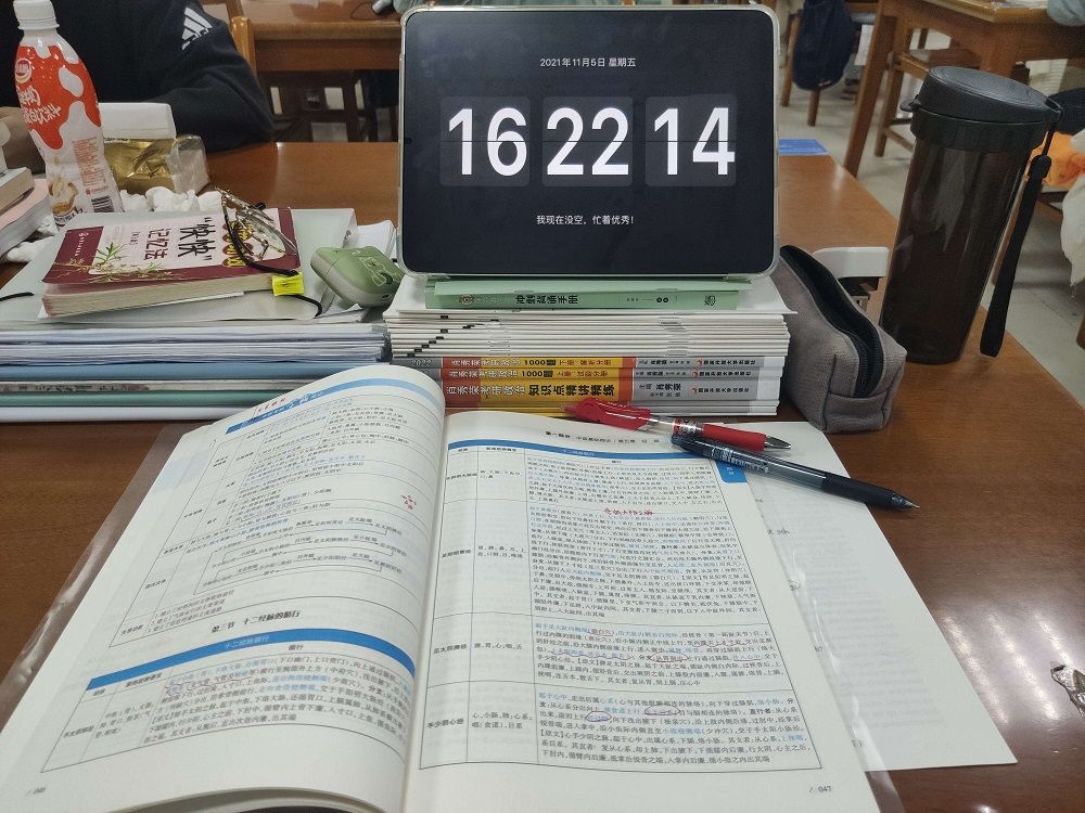 11月5日,湖北中医药大学针灸骨伤学院2017级学生熊继玲正在图书馆争分多秒地复习,桌上的平板时钟,是她最好的“复习伴侣”,提醒她时刻保持专注,提高复习效率。