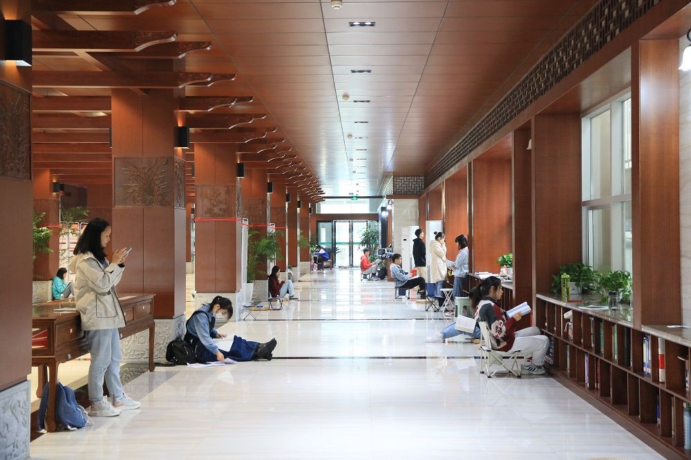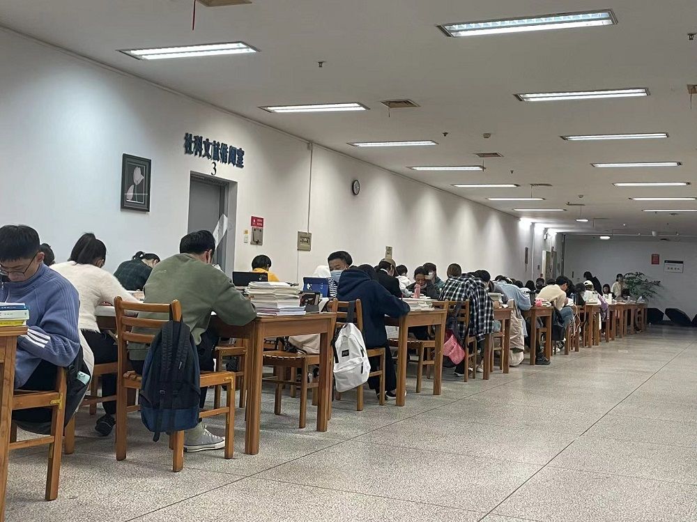 1月5日,中南财经政法大学南湖校区图书馆内,有同学带着自备的小板凳复习。边郑珊 摄