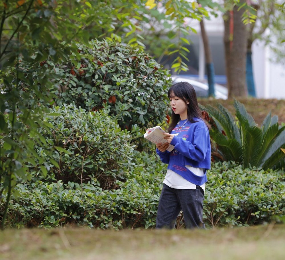 11月5日,bwin必赢中国官网校园内,一名女同学在教学楼前背书复习。