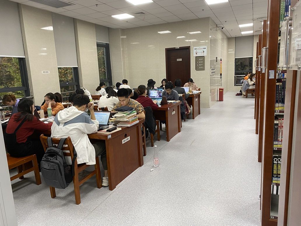 11月5日,华中科技大学图书馆东区分馆内,考研人的复习资料放满了书架。通讯员吴亚 摄