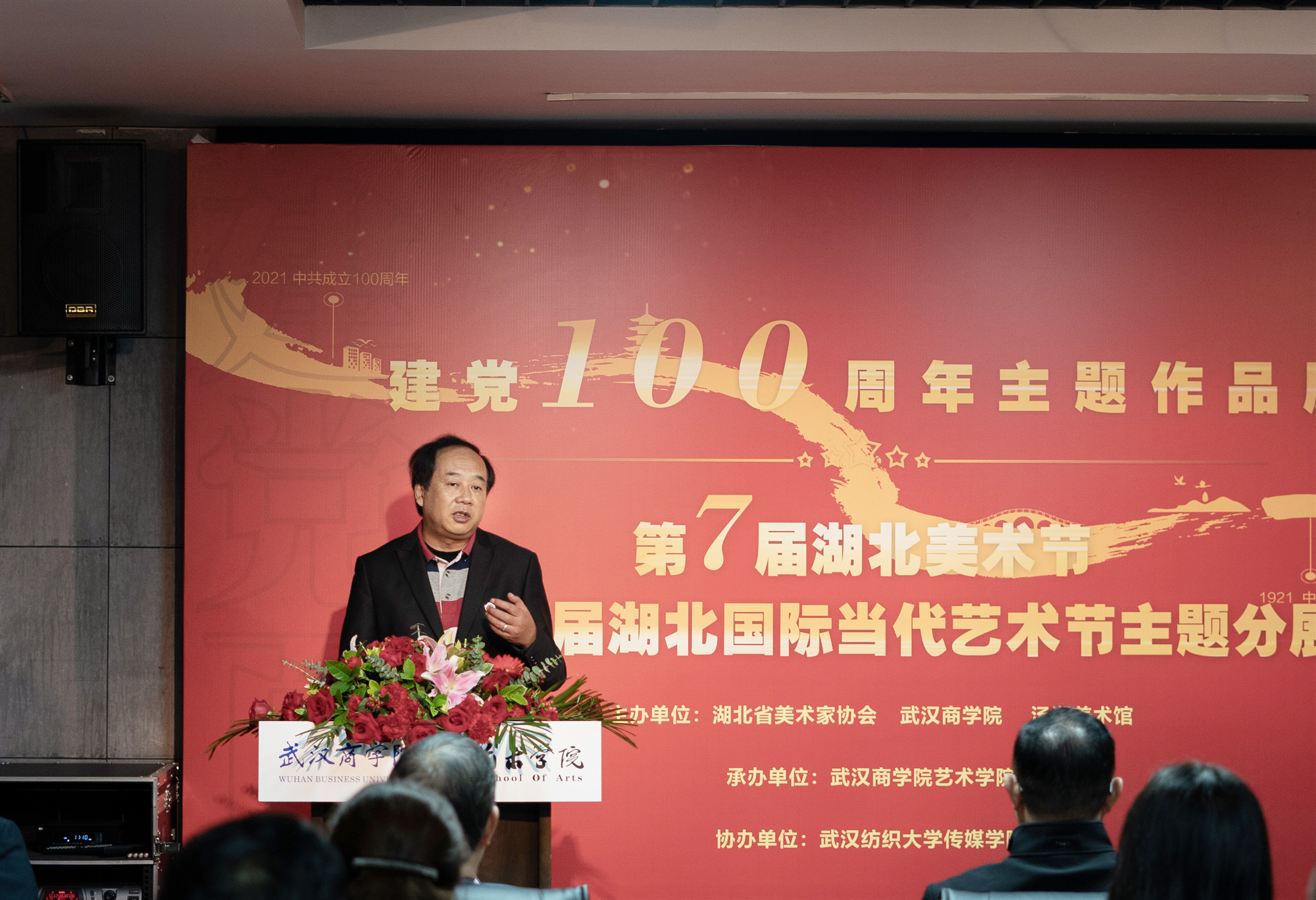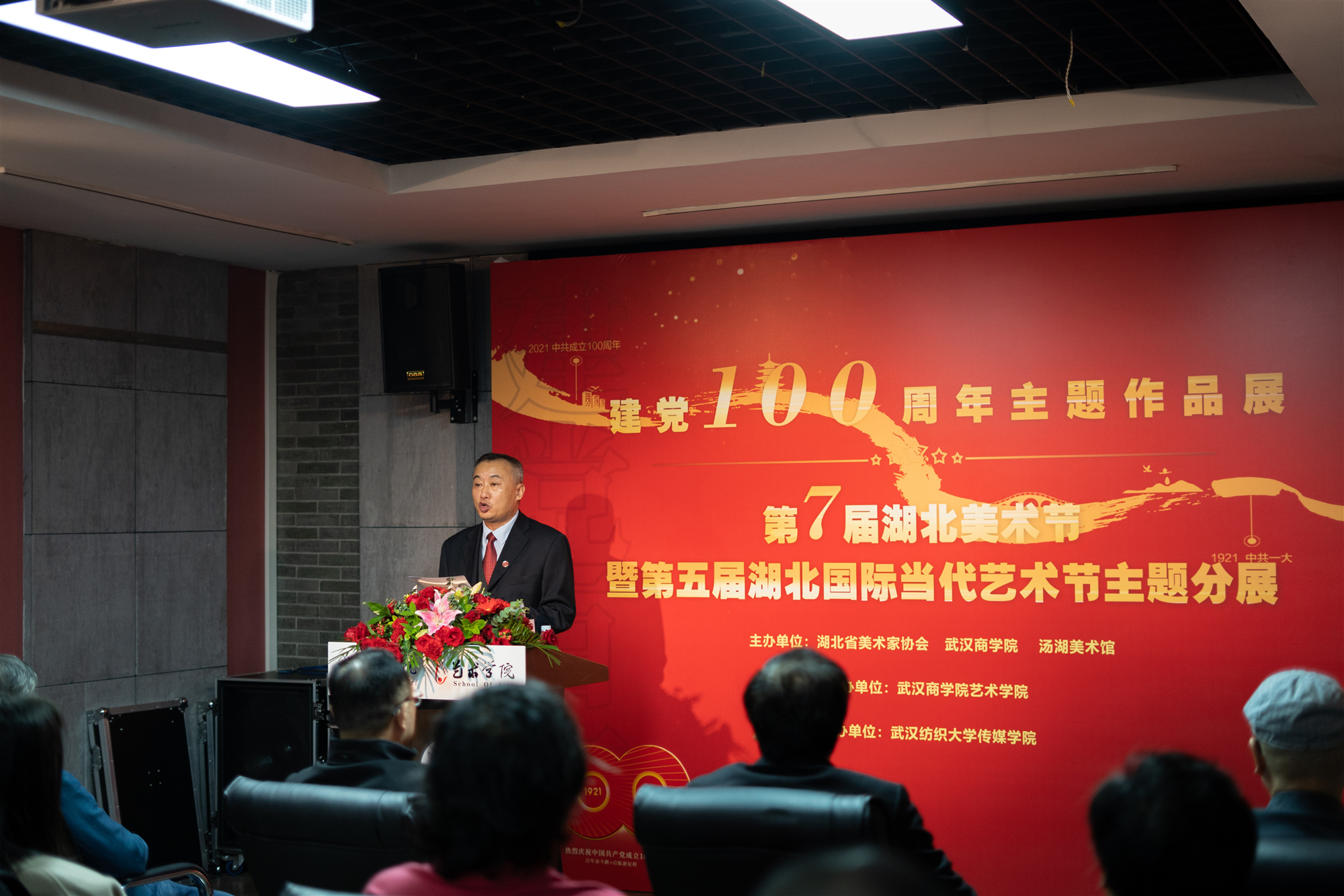 本网讯 11月5日,由我校与湖北省美术家协会、汤湖美术馆联合主办,我校艺术学院承办、武汉纺织大学传媒学院协办的“建党100周年主题美术作品展”在艺术学院艺术展示厅正式开展。美术展共集齐湖北美术节关于建党百年的十三个主题作品,以及众多我校师生响应主题的优秀作品,展现建党百年风华正茂。此次展览也是第七届湖北美术节暨第五届湖北国际当代艺术节主题分展。湖北省美术家协会秘书长刘春冰莅临展览,党委书记刘志辉宣布艺术展开展。
