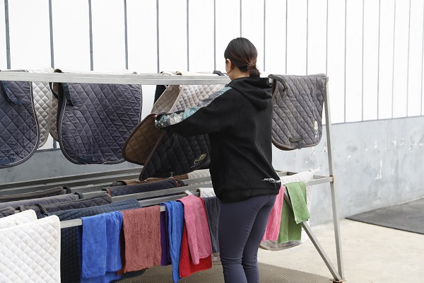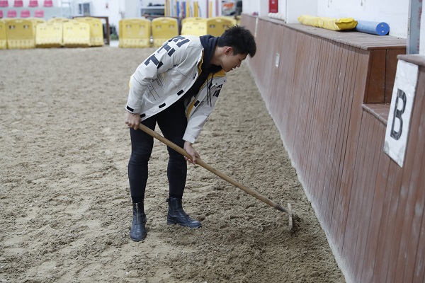 走进马房里面,其余的同学们也开始分门别类的整理摆放马鞍、护甲、头盔、马匹护理用具、精饲料等工具,方便日后在马匹教学中的使用。另外的同学们则用扫帚清扫每个死角,手拿抹布清洗室内独立马房的栏杆,保障干燥、整洁的马匹生活环境。在室内马场,铁耙犁是大家主要使用的工具,负责该区域的同学会细致的翻整马场的土地,保证纤维沙土的松软。这样既可以保护马脚、方便马匹教学过程,又可以保护骑手,防止训练过程中骑手摔下马匹后骨折、受伤。