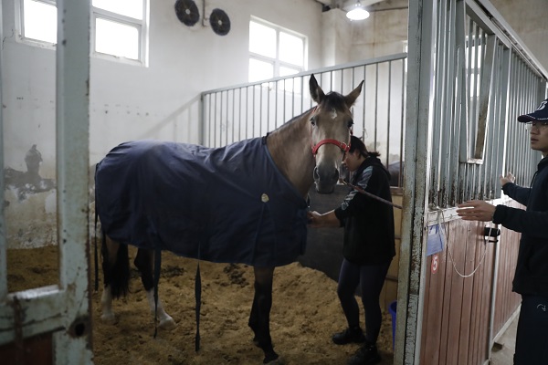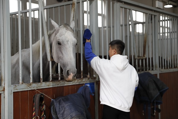 除此之外,11间室内独立马房里面也是此次劳动教育课程打扫的重点。需要清理的小马房有专门的同学进入清扫地面,针对马匹的受伤情况进行护理等细致地打扫保养。同时,今天这堂课上,同学们还给11匹马带来了一项“福利”,分别给4匹纯血进口马和7匹国产马穿上“新衣”,保护马匹、防寒御冷。这是北区马房内的马儿在今年降温之后第一次穿上马衣。