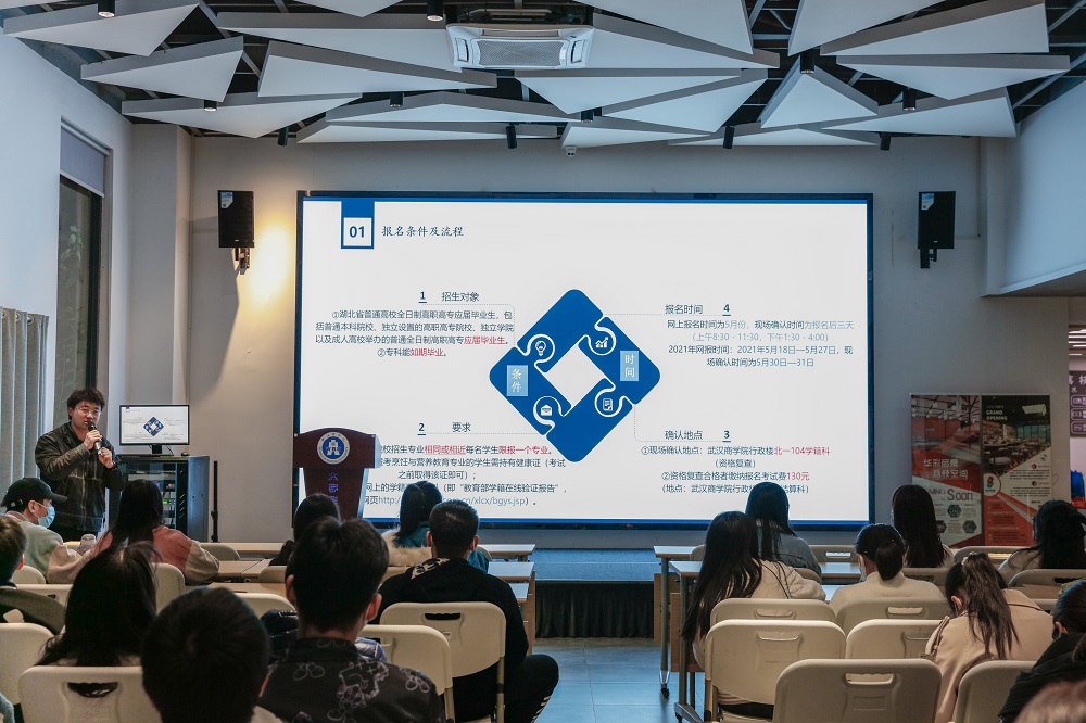 在讲座中,主讲人对专升本考试的条件及流程做了相关介绍,并展示我校2020及2021年的报录信息和录取分数情况。主讲人以武汉市高校为例为大家分析“专升本究竟如何选择院校”这一主题,并把不同学科类型专业进行详细分类,从不同角度为大家推荐专业院校。他强调,选择大于结果,同学们应该开放眼光,从自身需求出发选择合适的院校。