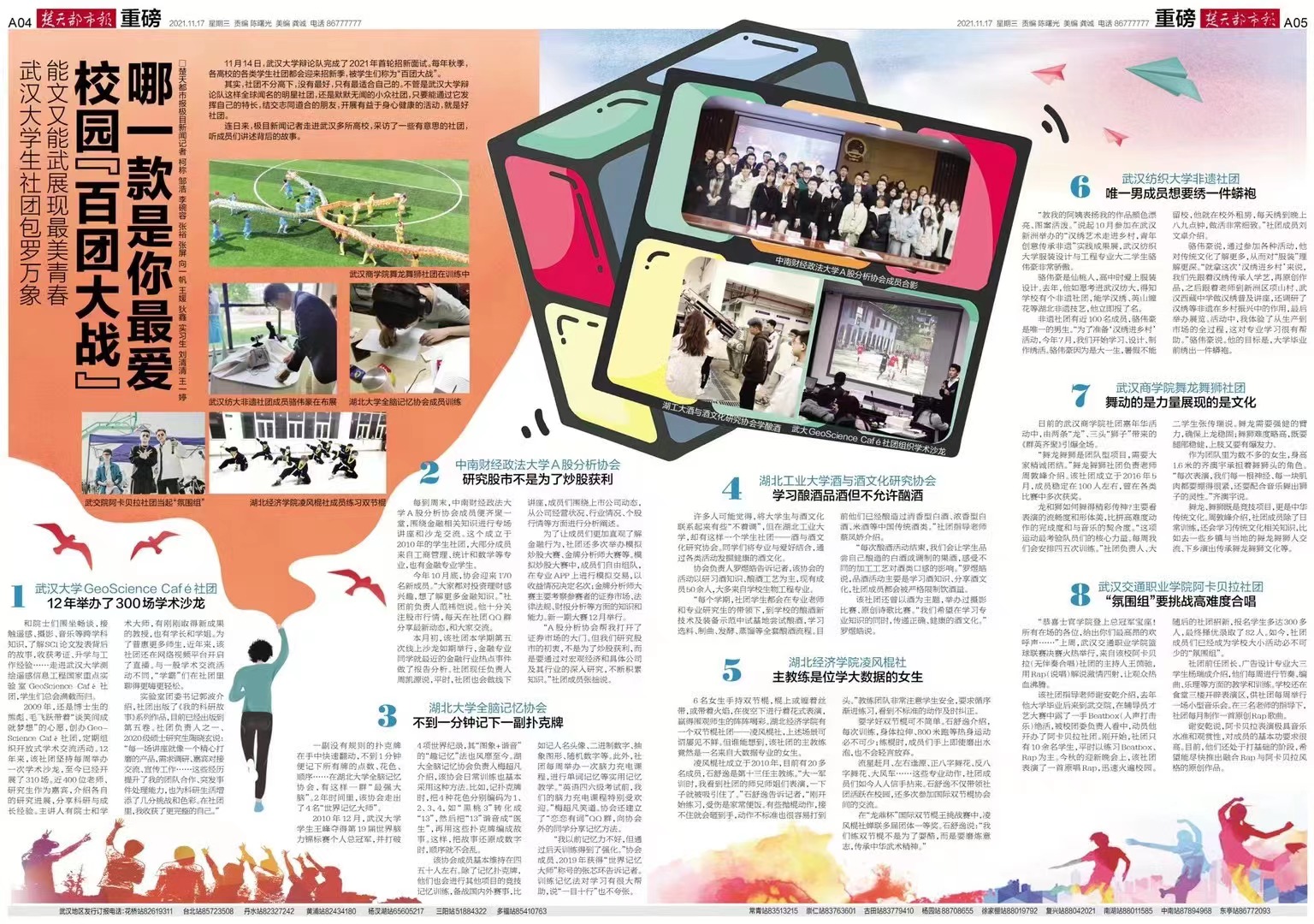 楚天都市报2021年11月17日刊登报道我校舞龙舞狮社团情况,展现舞动的力量。