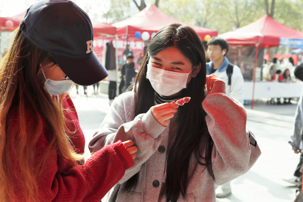 开展仅十分钟,我校北区食堂门口人头攒动,每个展位都吸引大量的同学前来参观。“无畏敢野、潮盒炸街”的潮玩社区中,各种特色盲盒、动漫周边、小众服饰和潮流玩物以及嘻哈涂鸦等潮流文化的宣传售卖引起同学们纷纷驻足挑选。“童年时光”作为最有特色的展位区包含了童画展位、童食展位。明信片、海报、玩偶、手工糕点、小人书、风车、飞行棋应有尽有,让同学们身临其境追忆童年纯真的记忆、体验童年的美好。手工DIY摊位将“椪糖”作为自己的招牌产品,用白砂糖、黑糖、水、小苏打熬制出的一种糖体。“椪糖不但是一种古早零食,还可制作成一种‘椪糖游戏’”2020级马术专业的张芳介绍到。“制作椪糖的过程中需要掌握好火候以及材料的用量,不然会影响它的外观和口感。做椪糖的失败率虽高,但我喜欢做手工、做美食,此次参展能够锻炼自己的动手能力、社交能力。”张芳说。