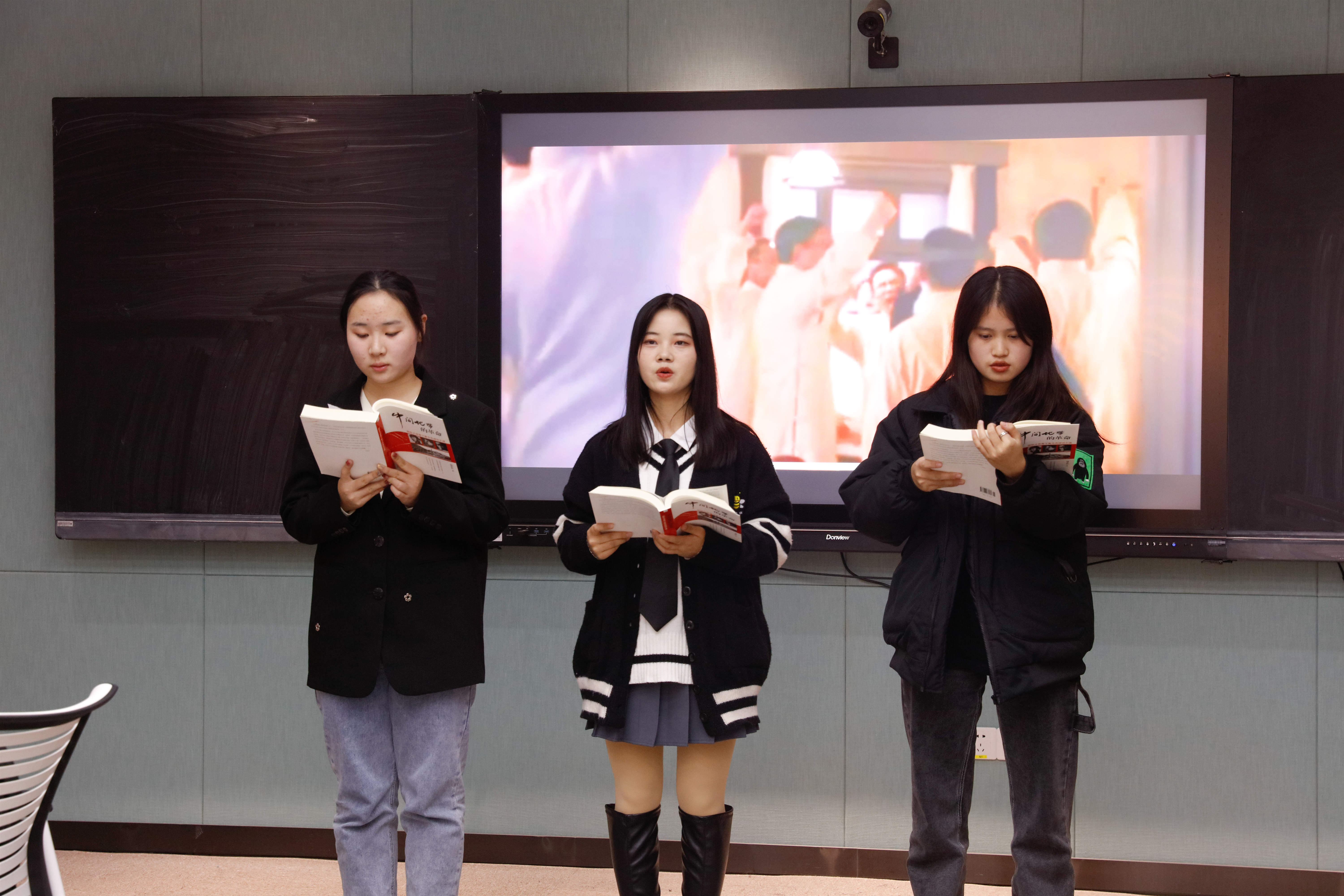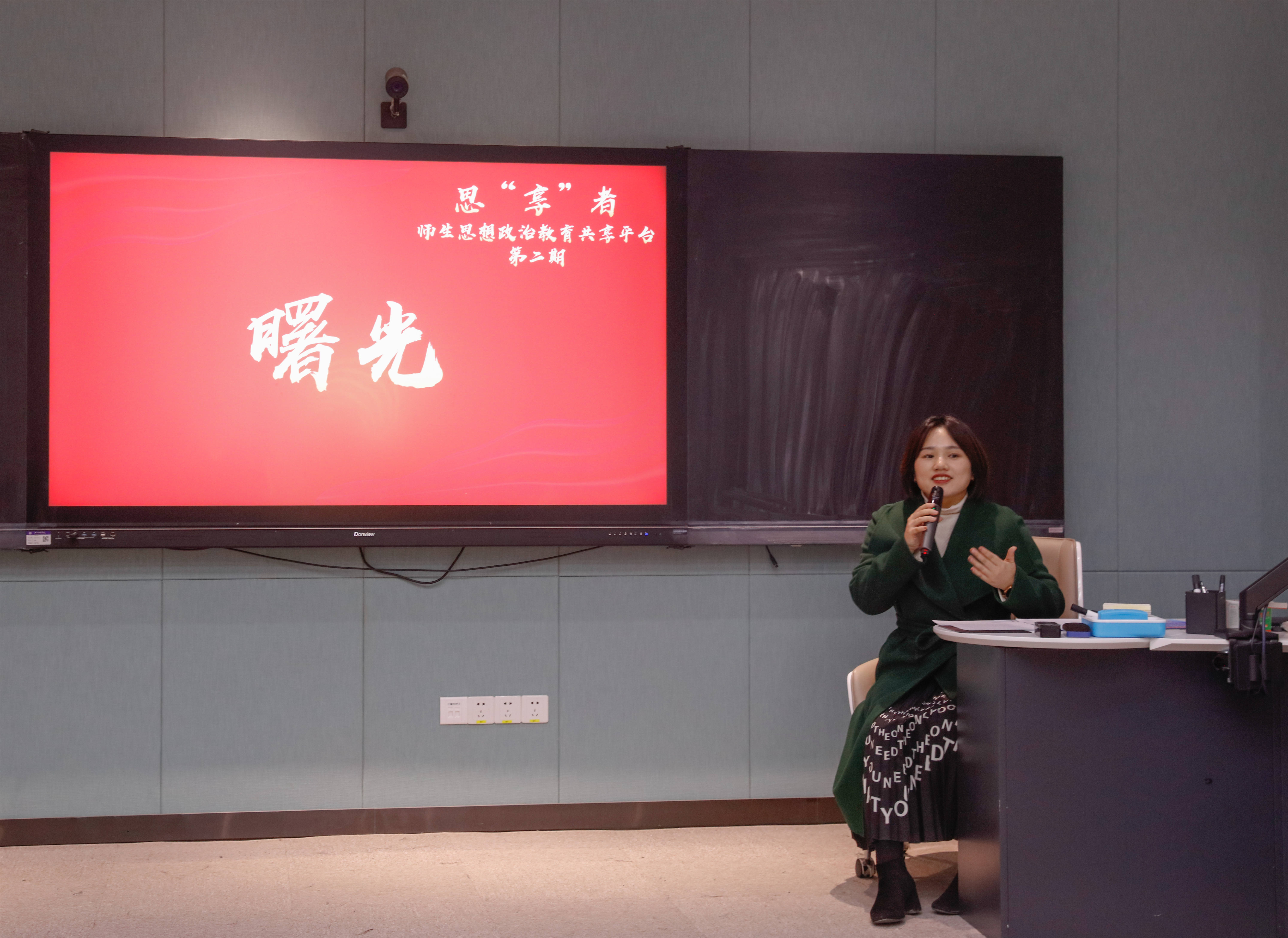 本次活动共分为朗诵表演、观点分享、特色思政课和读书笔记分享四个环节。今年恰逢中国共产党成立100周年,同学们以致敬红色经典为主旋律,通过诗朗诵、情景剧和唱红歌等方式生动还原历史场景。情景剧《金色的鱼钩》讲述了红军长征中老班长舍己为人的感人故事,让在场的同学都禁不住湿润了眼眶。随后特研会成员向在场的观众分享了这段时间成员们的读书感悟。梅子涵同学在分享自己的采访视频和阅读经历后表示:“学习红色党史从来不应该只局限于被迫打卡任务的形式,当代大学生更应该沉下来主动了解相关知识,提高思想觉悟,从心中真正领悟到中国共产党历久弥新的魅力。”紧接着同学们依次分享了书中最令自己动容和印象深刻的句子。从细节入手,激发同学们的共情能力,提高同学们阅读的兴趣。这样的分享形式也得到了在场老师和同学们的一致好评。