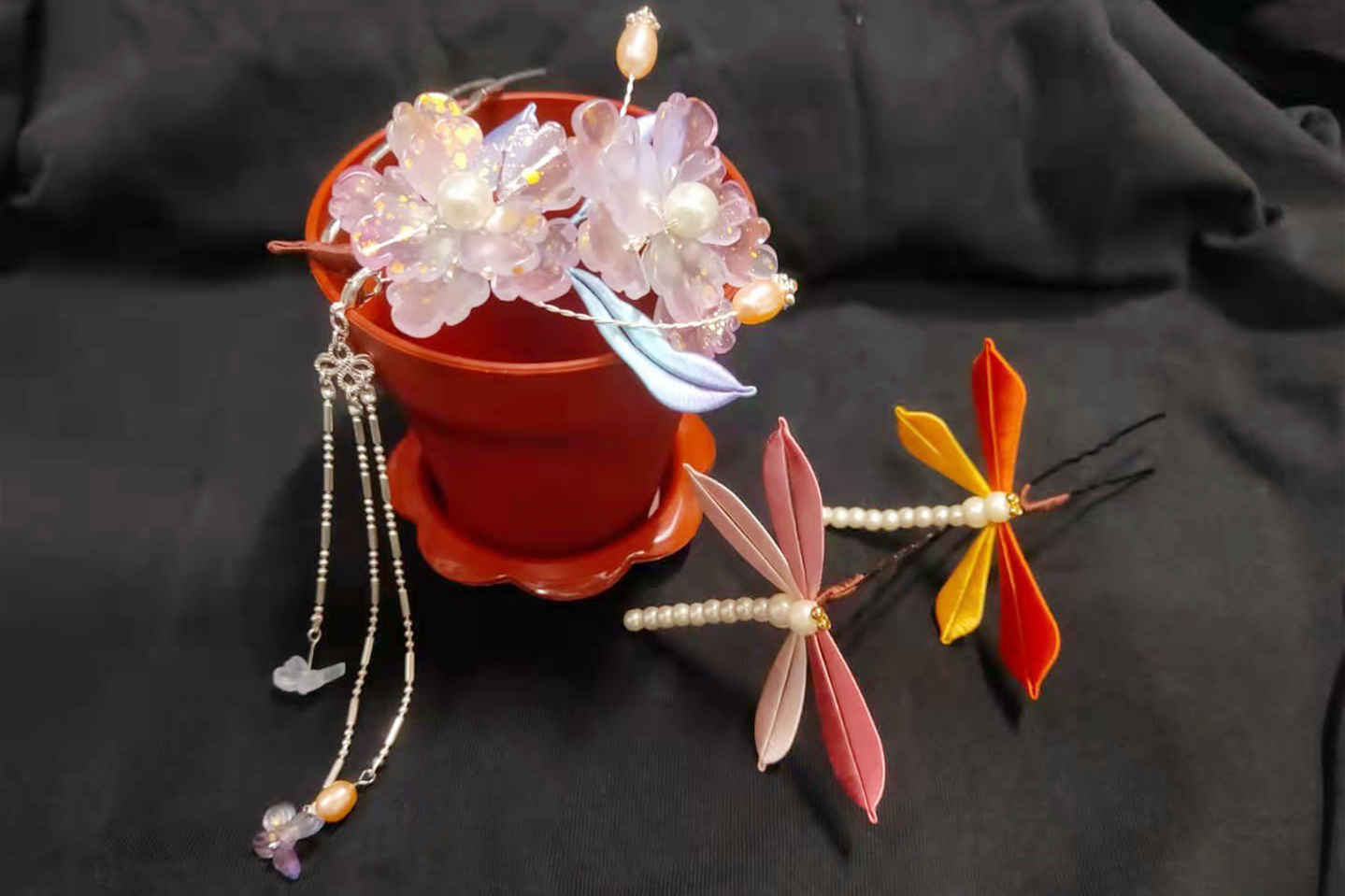 本网讯 将头发散落梳理整齐,全部握在手里之后,另外一只手抓住稍微靠后一些,杨敏敏拿出准备好的非遗缠花发簪,把发簪的尖端放在马尾的发根的位置。一只手紧握发簪,另外一只手抓住马尾辫的尾端,将马尾缠绕在发簪的身子轻轻缠绕一圈……在我校11月10日举办的创业集市活动上,杨敏敏的缠花摊位前总是传来阵阵赞叹,感兴趣的同学们纷纷聚集在摊位前,聚精会神盯着杨敏敏亲手给大家演示如何佩戴缠花发簪。