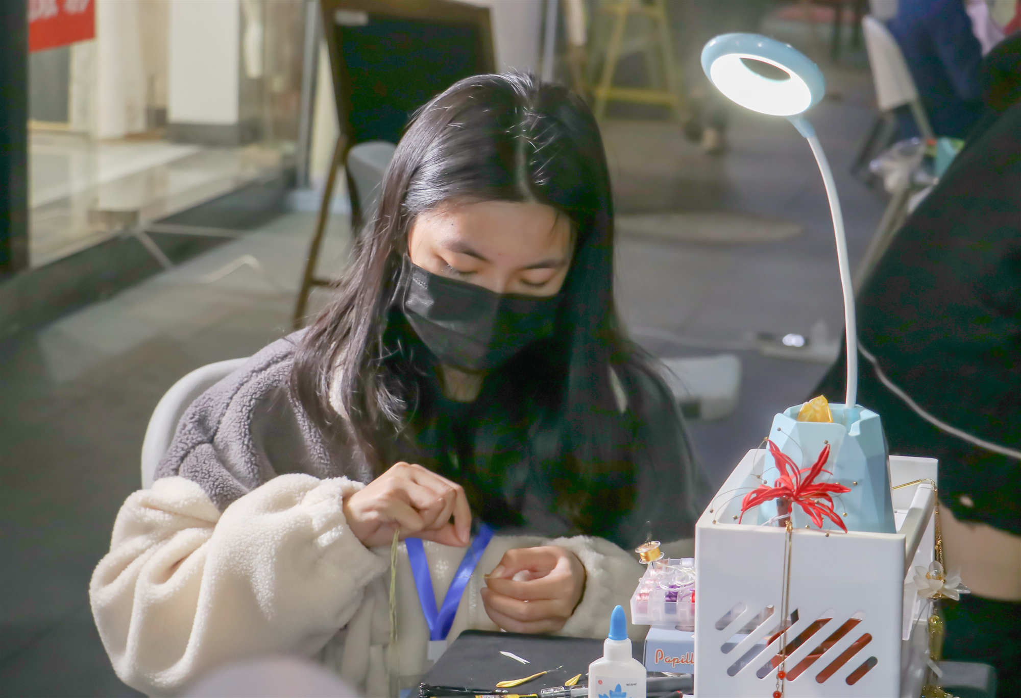 在我校食品科技学院,大三学生的杨敏敏已经是一位“小有名气”非遗缠花达人。热爱传统文化的她已经自学制作非遗缠花多年。借此次创业集市活动,她的缠花作品吸引了更多人的关注。摆摊的第6分钟,杨敏敏就成交了自己摊位的第一单,一对长命锁配珍珠耳坠外加一支丝线玫瑰簪子,合计50元,收获了缠花的第一桶金也让她对自己制作的缠花饰品更加有信心,“之前做的一些缠花都是自己在用,没想到它也能受到这么多人的喜欢。”在两天的创意集市活动中,杨敏敏摊位上的15件缠花作品早早售卖一空,其中还有两位喜欢的女生加了她的联系方式,预定了3件缠花作品。