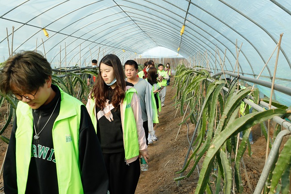 “青马班这次的户外拓展就是为了让同学们亲眼所见农作物的生长过程,亲身感受农民伯伯的辛苦劳作,从而获得对生活的感悟。”青马班负责人龚朱艺文说。在武汉东荆龙凯生态园,工作人员带领同学们参观了包括火龙果,柑橘等水果在内的有机种植区,同学们欣赏着有机水果,感受农作人员的辛勤成果。