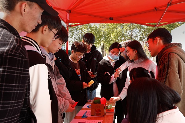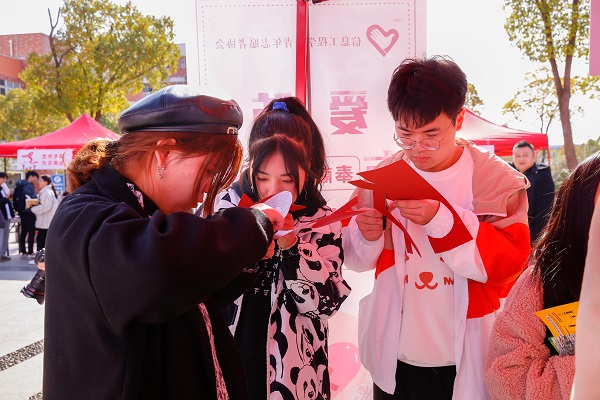 活动现场,10个学院的防艾活动摊位前人头攒动,不少同学跃跃欲试。在信息工程学院的摊位上,大家纷纷通过手工的形式学习了解防艾知识。一根红色折叠的飘带在同学们手中的剪刀下稍加剪裁便呈现出“防艾红丝带”的标志。在艺术学院摊位前,同学们用手中的画笔描绘以“防艾”为主题的图景,展现了大家对防艾知识的不同理解。食品科技学院则充分利用专业知识,让学生进行自主食材搭配,了解什么样的食物更适合艾滋病患者。