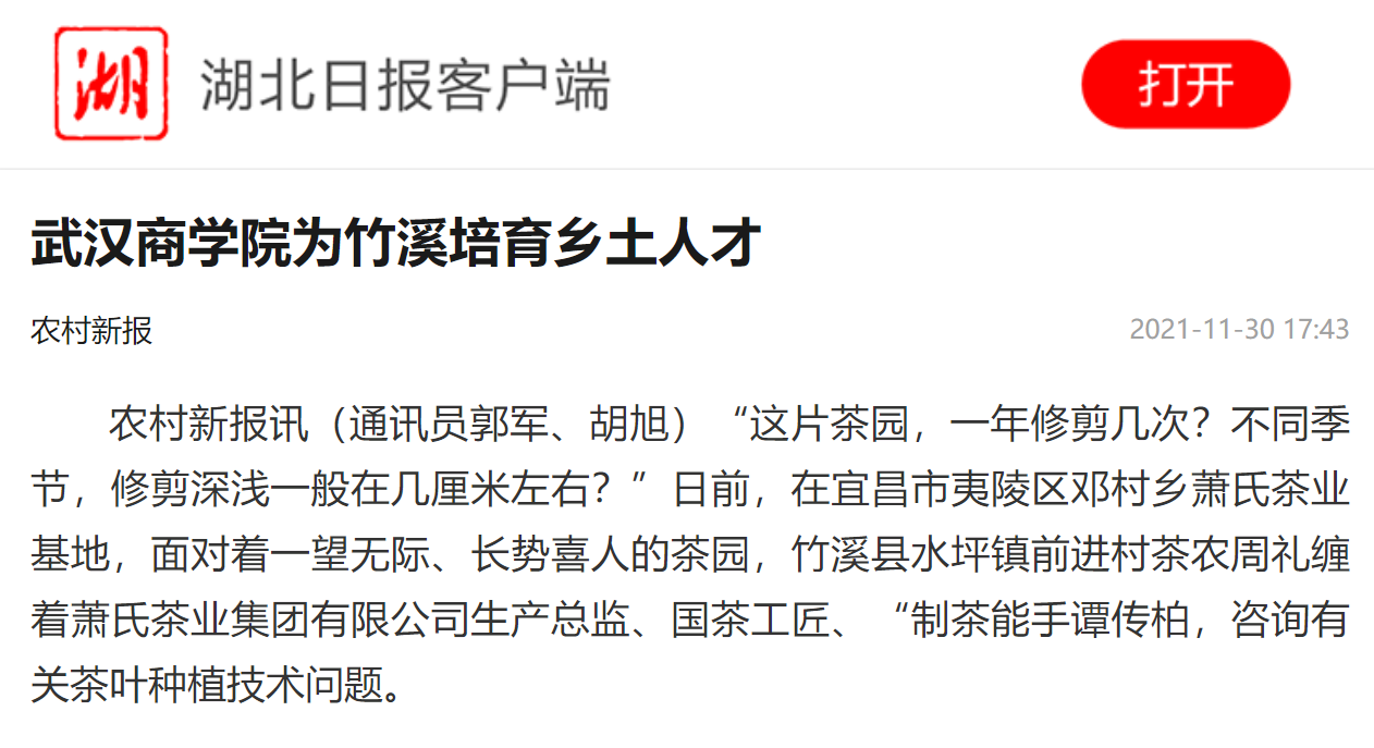 农村新报讯(通讯员郭军、胡旭)“这片茶园,一年修剪几次?不同季节,修剪深浅一般在几厘米左右?”日前,在宜昌市夷陵区邓村乡萧氏茶业基地,面对着一望无际、长势喜人的茶园,竹溪县水坪镇前进村茶农周礼缠着萧氏茶业集团有限公司生产总监、国茶工匠、“制茶能手谭传柏,咨询有关茶叶种植技术问题。