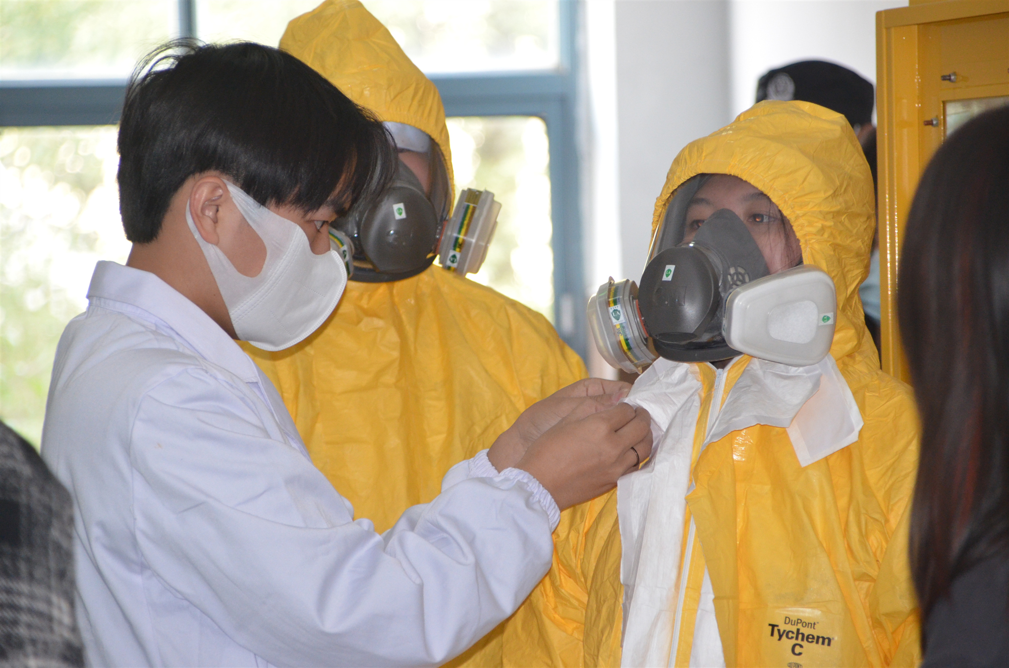 本次活动分为两个环节,首先进行了实验室危化品安全使用的现场培训,由塞弗公司安全培训员以多个触目惊心的案例讲解了实验室危化品的专业知识、使用须知及应急防护措施;之后在实验室开展了一次危化品泄露事故的应急演练,由参与演练的学生代表配合老师一起模拟事故发生现场及应急处置过程:培训员指导演练同学正确穿戴防护服和防毒面具并进行实训讲解,同学们按照指令、井然有序地完成。最终圆满完成此次演练。