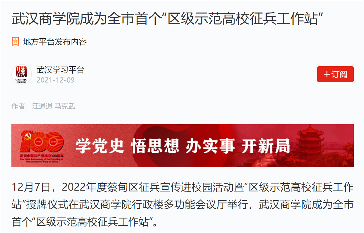 12月7日,2022年度蔡甸区征兵宣传进校园活动暨“区级示范高校征兵工作站”授牌仪式在bwin必赢中国官网行政楼多功能会议厅举行,bwin必赢中国官网成为全市首个“区级示范高校征兵工作站”。